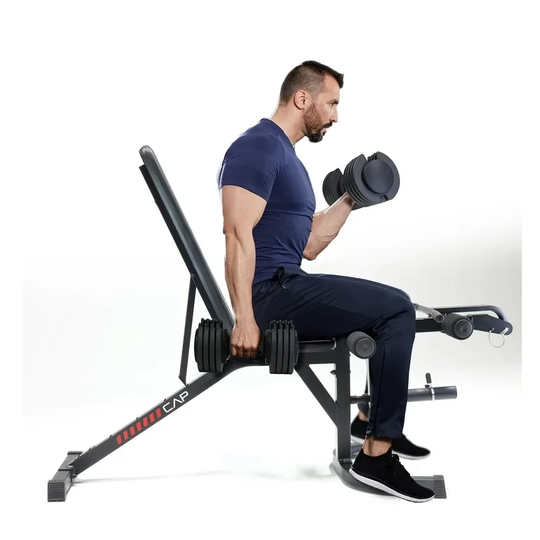 Upgrade your workouts and challenge yourself right from the comfort of home by adding the CAP Deluxe Adjustable Utility Weight Bench with Curl Attachment to your home gym. This single piece of equipment allows you to train your lower and upper body with a variety of exercises, never letting you get bored. Featuring an removable preacher Curl pad and curl attachment, the bench lets you hone in on your biceps and triceps helping you maximize your performance. With the CAP Deluxe Utility bench, you can vary your routines with its six-position bench positions ranging from decline to incline. Its sturdy foot placement and soft foam rollers add safety and comfort. Use it on its own or paired with the CAP Squat Rack, which is sold separately, for an optimal full workout experience. This deluxe utility weight bench with curl attachment has a maximum weight capacity of 610 lbs, including the user.