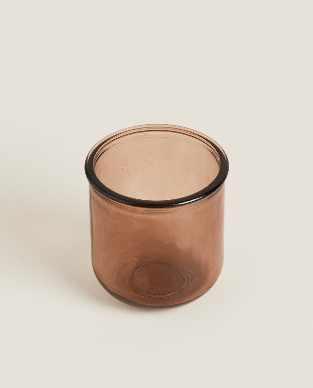 Caramel-colored glass bathroom tumbler.