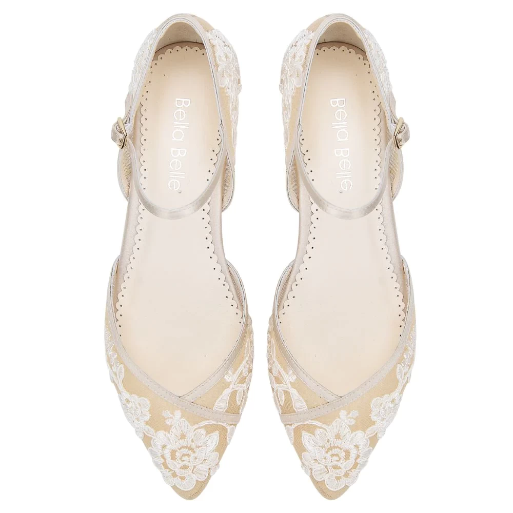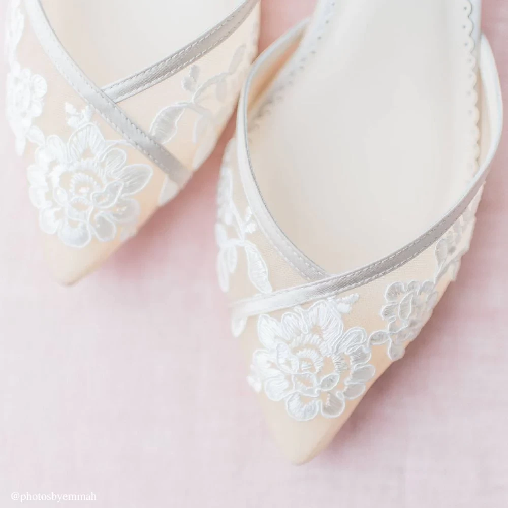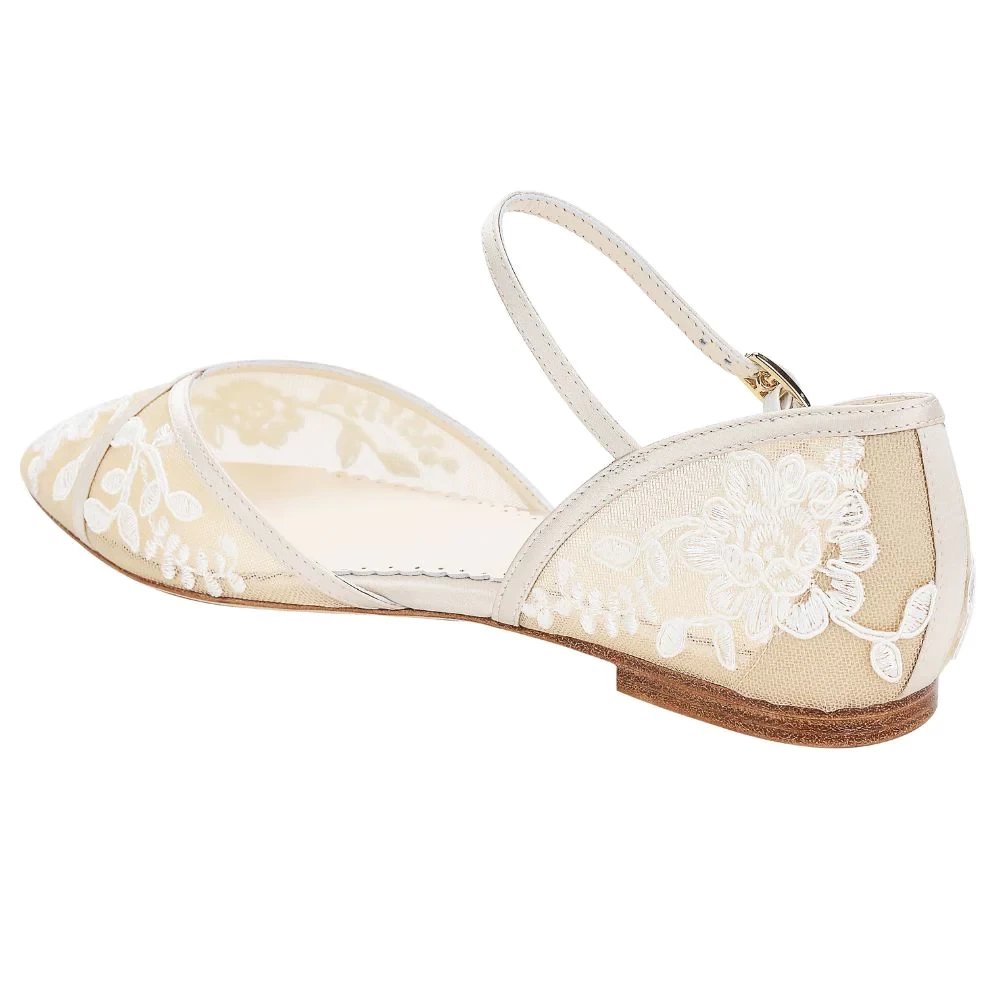 Say goodbye to frumpy-looking flats. These romantic nude flats for weddings are embroidered with ivory lace vines on a tinted mesh. The D'Orsay cut exposes the curved instep of the foot. Add ankle straps for secure fitting to make these the perfect nude flats for wedding wear.