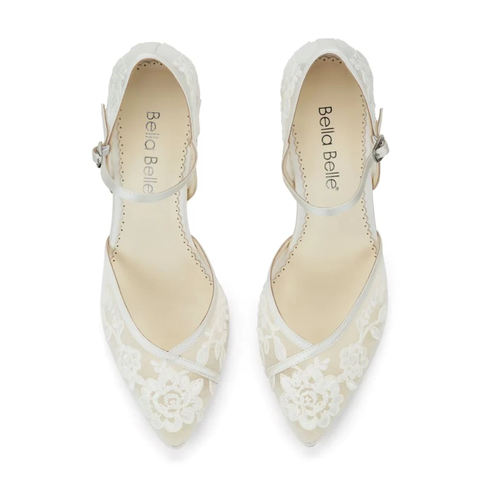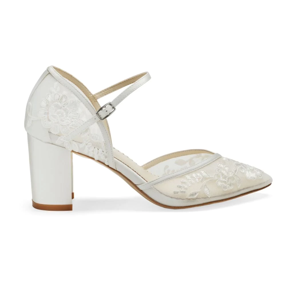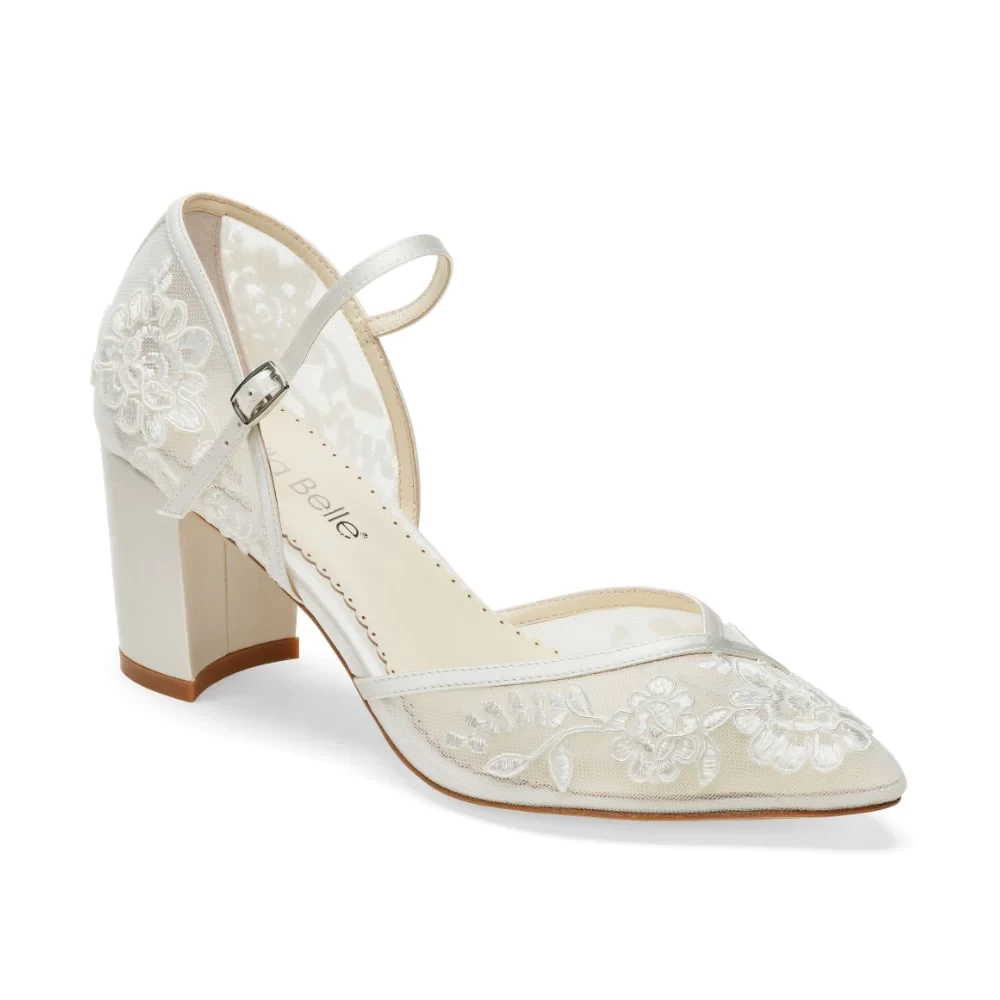 These ivory lace wedding shoes feature embroidered white vines on tinted illusion mesh. Our Chelsea lace block heel is romantic and a sexy take on a classic D'Orsay pump. A sturdy block heel and ankle strap ensure Chelsea's secure fit— perfect for an outdoor wedding or all-day ceremony.