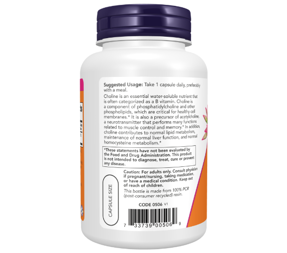 Choline is an essential water-soluble nutrient that is often categorized as a B vitamin. Choline is a component of phosphatidylcholine and other phospholipids, which are critical for healthy cell membranes.* It is also a precursor of acetylcholine, a neurotransmitter that performs many functions related to muscle control and memory.* In addition, choline contributes to normal lipid metabolism, maintenance of normal liver function, and normal homocysteine metabolism.*