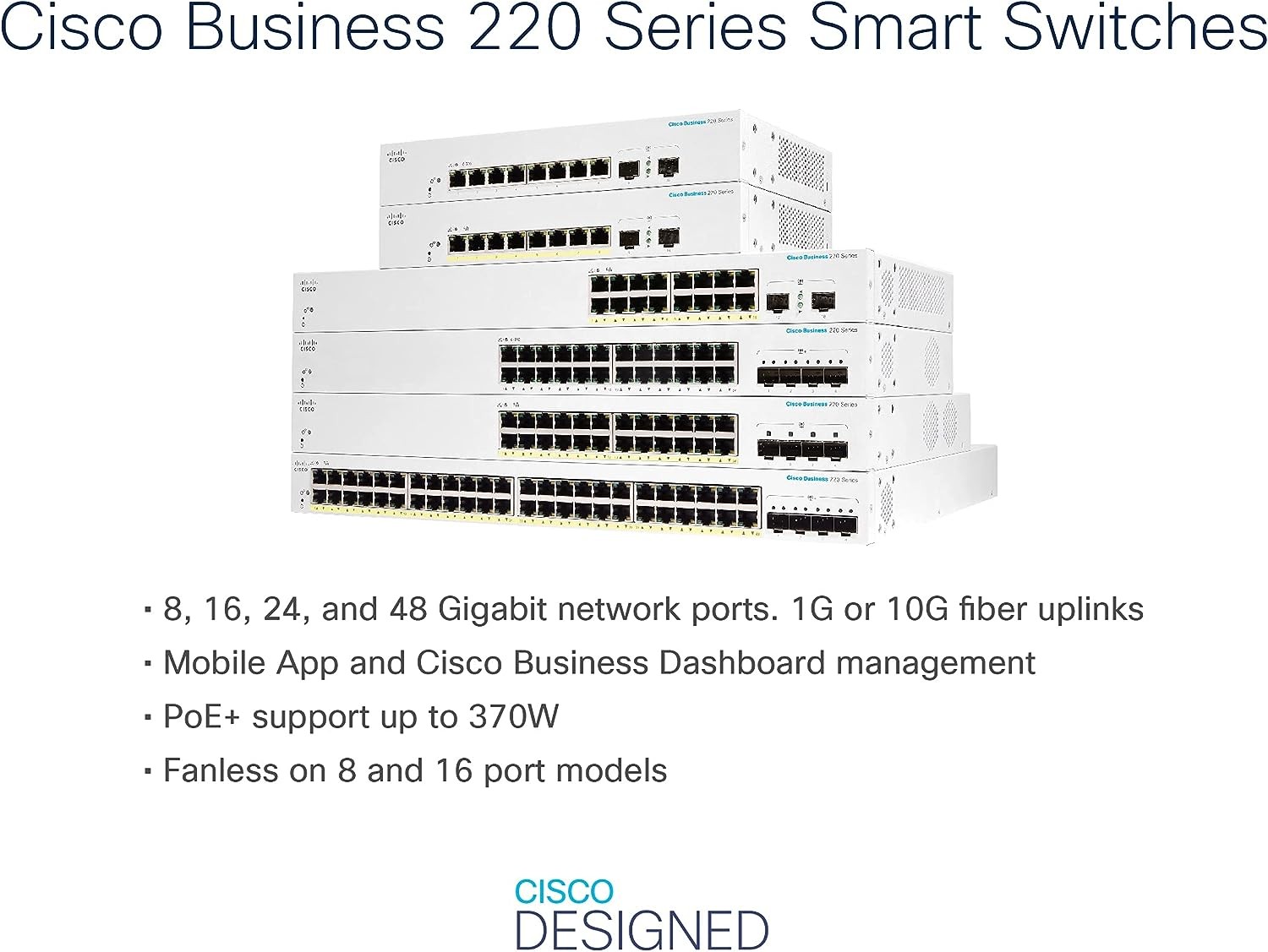 Cisco Business CBS220-24T-4G Smart Switch | 24 Port GE | 4x1G SFP & StarTech.com 8 Outlet Horizontal 1U Rack Mount PDU Power Strip - Surge Protection - 120V/15A - w/ 6ft Power Cord