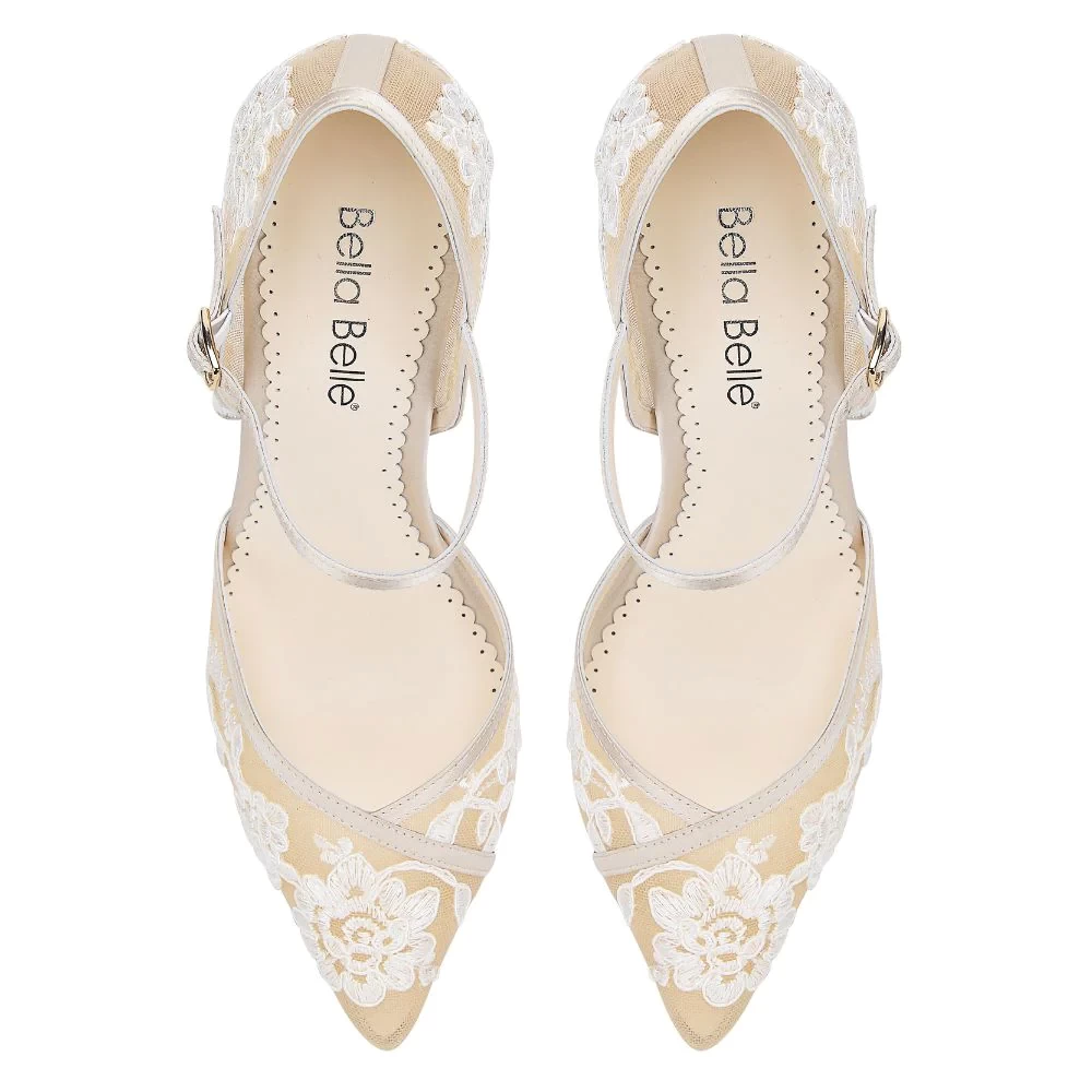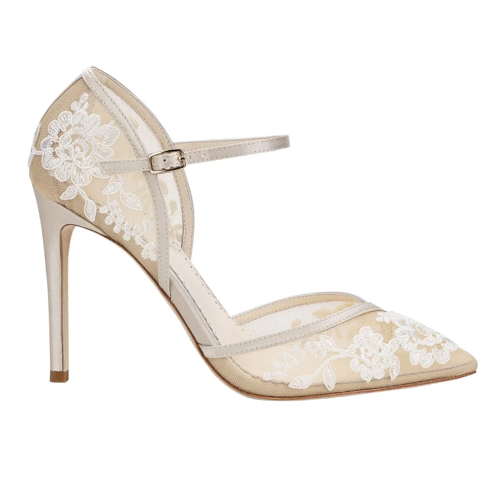 These sultry lace heels feature hand-embroidered vines on nude illusion mesh. The D'Orsay cut adds a sexy edge by exposing the foot's delicate curved instep. Add an ankle strap for secure fitting to make Claudia the perfect nude lace heels for anyone seeking a classic, sexy look.