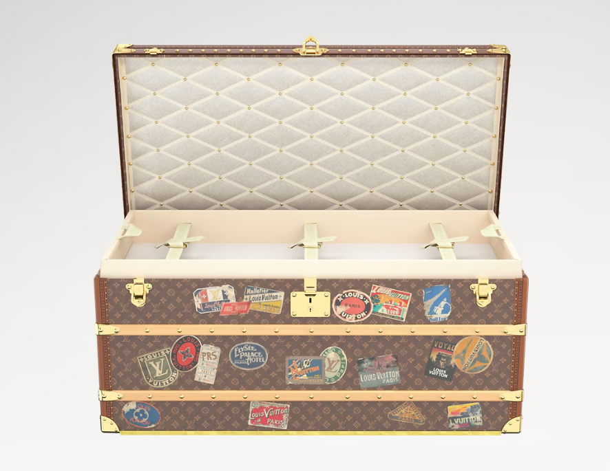 Inspired by archival Monogram canvas, embellished with a patchwork of vintage hotel labels and trimmed with the Maison’s heritage natural cowhide-leather, the Courrier Lozine 110 is an ideal addition to any interior.