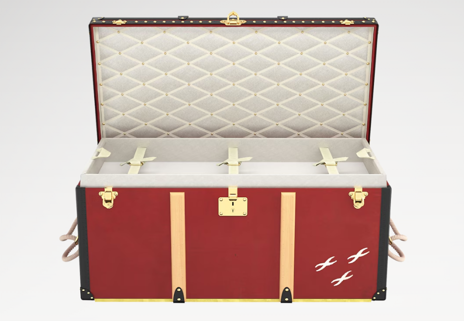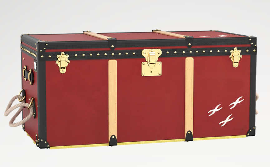 The Courrier Lozine 110 Time Trunk is directly inspired by a special order from the House archives. Its distinctive look is characterized by red canvas, vertical wooden slats, and rope side handles, as well as the emblematic S-lock closure.