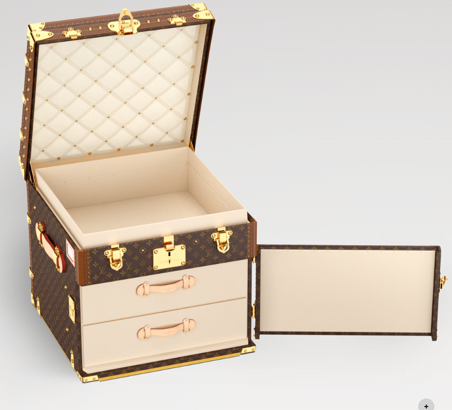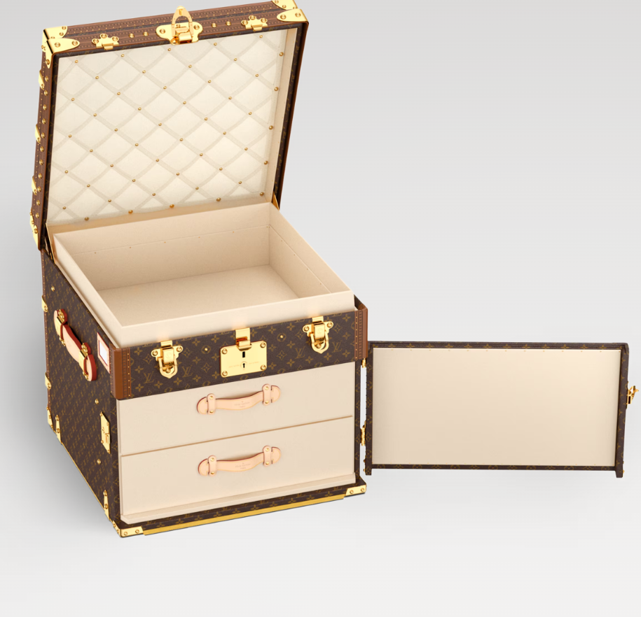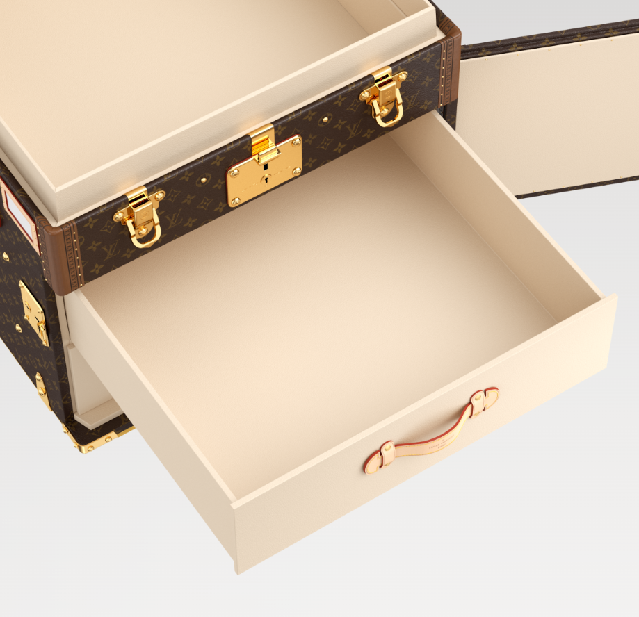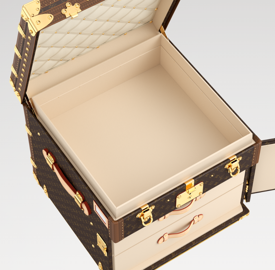 Louis Vuitton’s trunk craftsmanship is perpetuated in the square Malle Courrier Lozine Carre Gauche. Fashioned from Monogram canvas with traditional natural cowhide-leather trim, this hard case opens up to reveal two drawers and a lid lined with plush diamond-shaped quilting. This case opens to the right.
