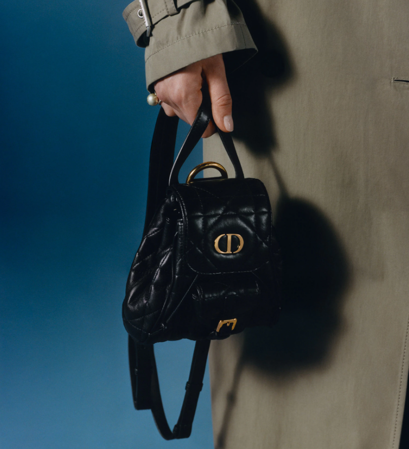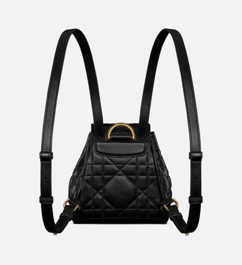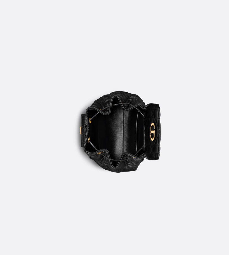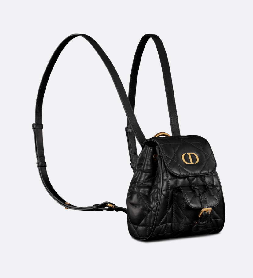 New for Summer 2025, the Dior Caro nano backpack embodies modern and elegant style. Crafted in black lambskin elevated by Macrocannage topstitching, the design features a flap adorned with an antique gold-finish metal CD signature that opens to reveal a drawstring main compartment, while a flap pocket can hold all small essentials. The backpack has a gold-finish handle and adjustable straps for added comfort.