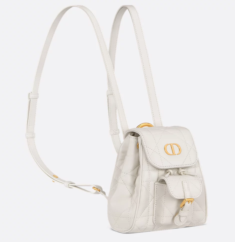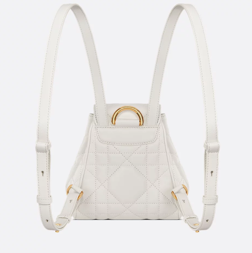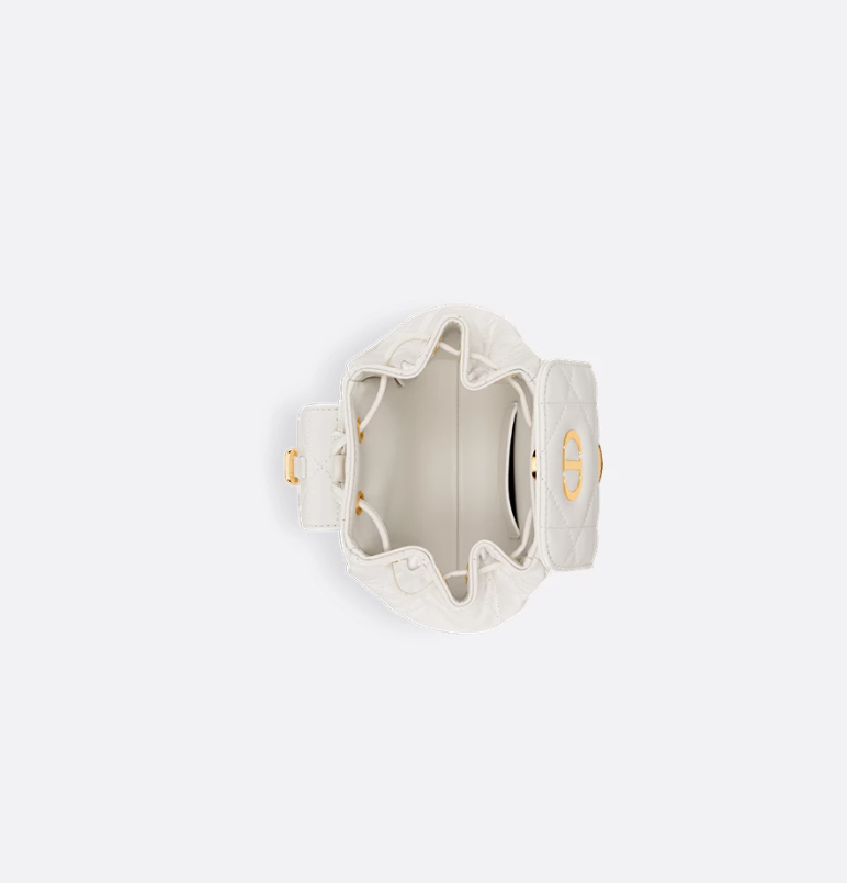 New for Summer 2025, the Dior Caro nano backpack embodies modern and elegant style. Crafted in latte lambskin elevated by Macrocannage topstitching, the design features a flap adorned with an antique gold-finish metal CD signature that opens to reveal a drawstring main compartment, while a flap pocket can hold all small essentials. The backpack has a gold-finish handle and adjustable straps for added comfort.