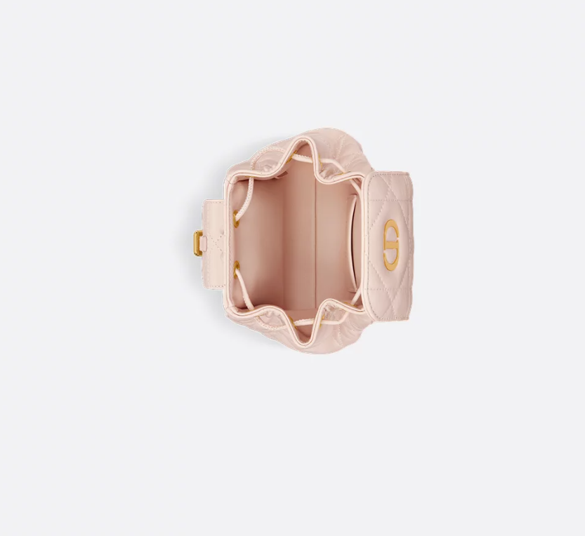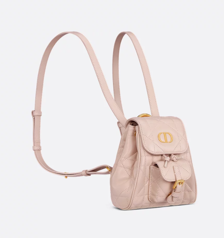 New for Summer 2025, the Dior Caro nano backpack embodies modern and elegant style. Crafted in powder pink lambskin elevated by Macrocannage topstitching, the design features a flap adorned with an antique gold-finish metal CD signature that opens to reveal a drawstring main compartment, while a flap pocket can hold small essentials. The backpack has a gold-finish handle and adjustable straps for added comfort.