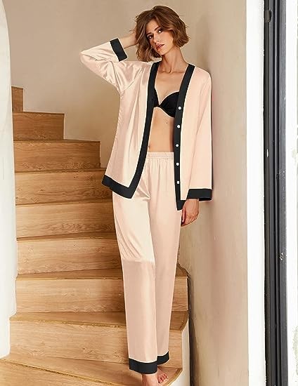 Unique Experience:Womens silk satin sleepwear use the H-shaped loose design.Delicate cutting makes this pajamas sets chic and unique.Put on this Pajama,you will surely get praise from others and make the simple everyday moments more glamorous.