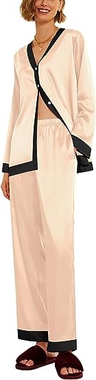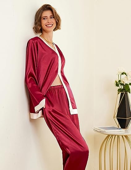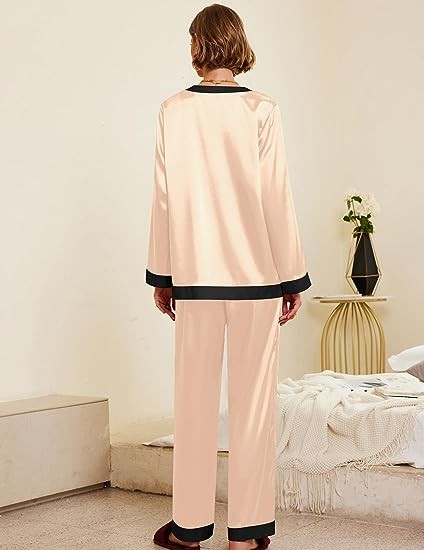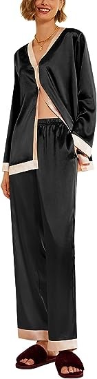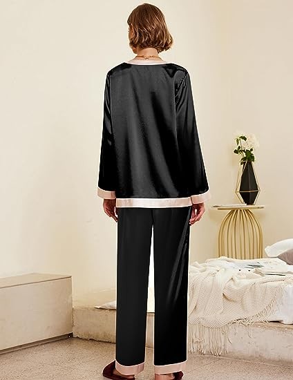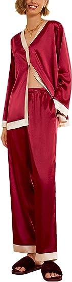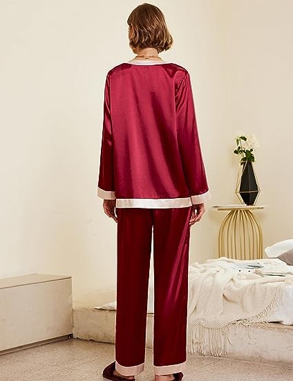 Premium Material:Womens satin pajama set is made of 95%polyester,5%spandex,it feels soft and skin-friendly,two piece sleepwear set with natural shiny appearance,elegant and luxurious,provide you with an excellent and comfortable sleeping night.