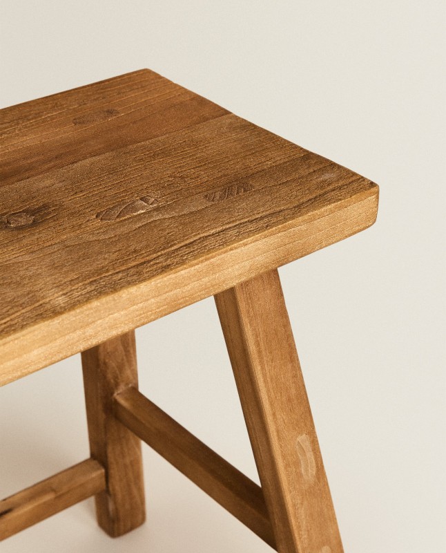Rectangular stool made of 100% elm wood. No assembly required.