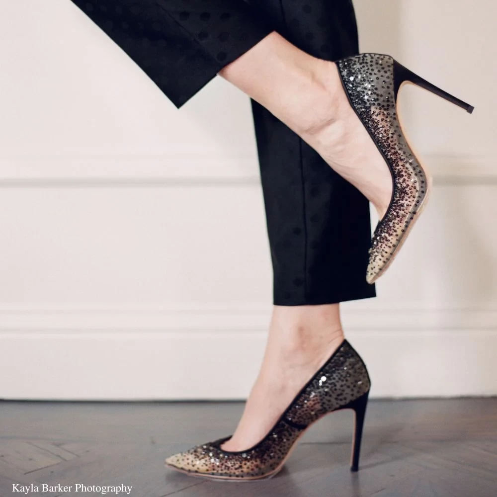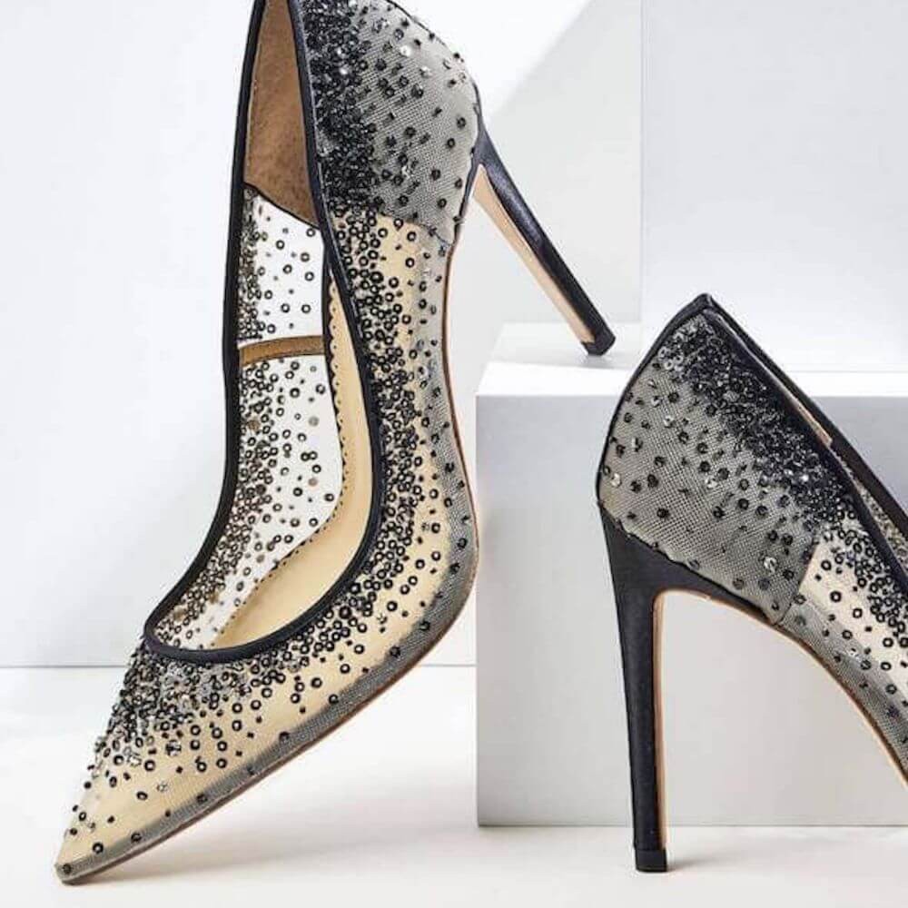 These stunning Cinderella embellished heel pumps feature hand-beaded sequin dégradé and crystal strass with a beautiful effect of shimmer on a nude mesh. Elsa Black crystal embellished pumps are a comfortable, modern take on Cinderella's glass slippers crystal embellished heels.