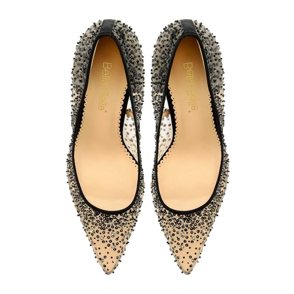 ELSA BLACK Crystal Embellished Heels with Black Sequin on Nude Mesh
