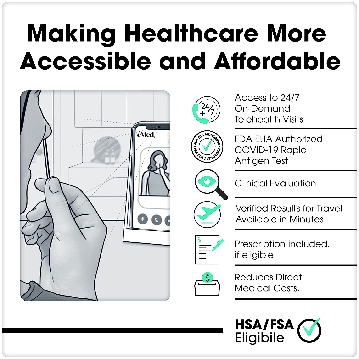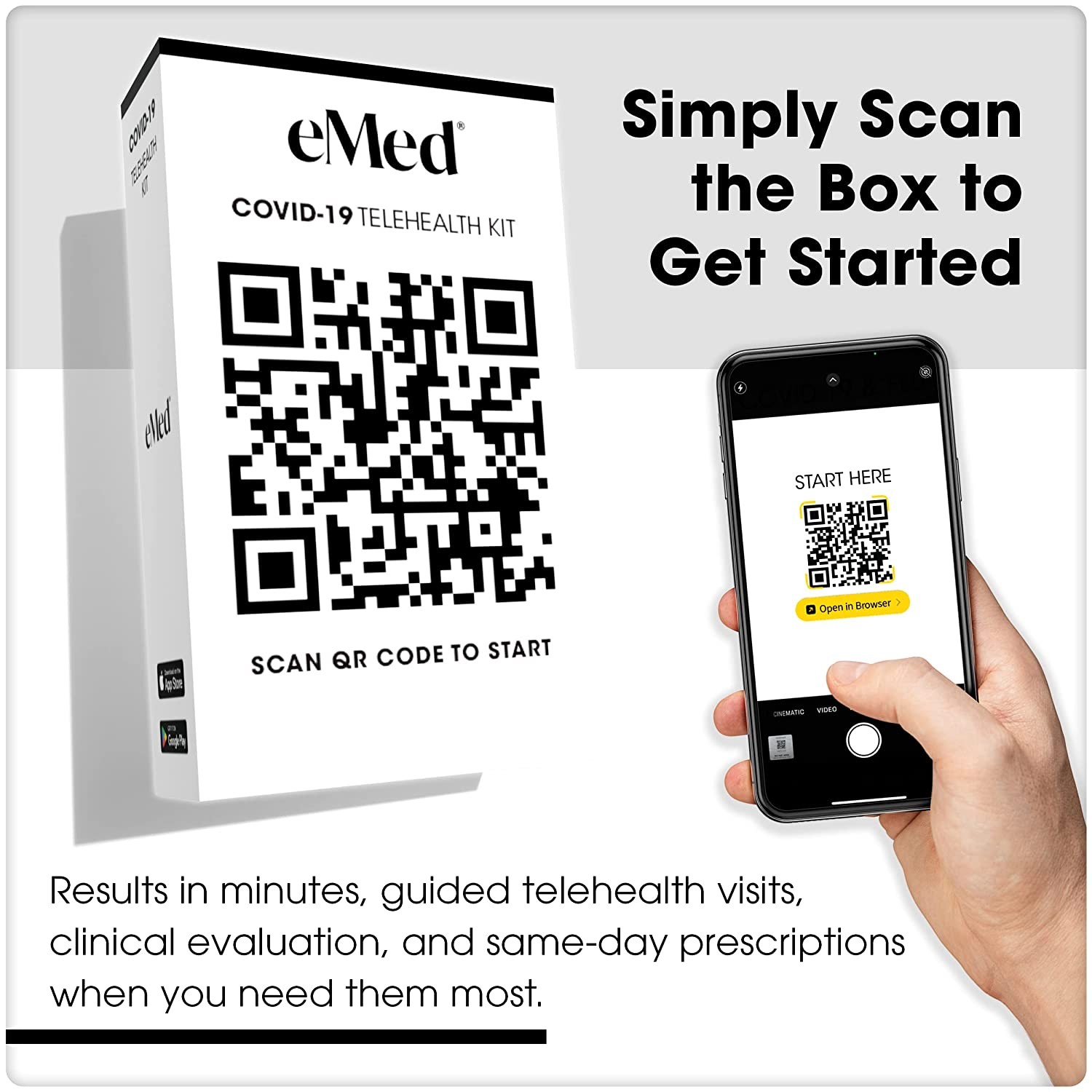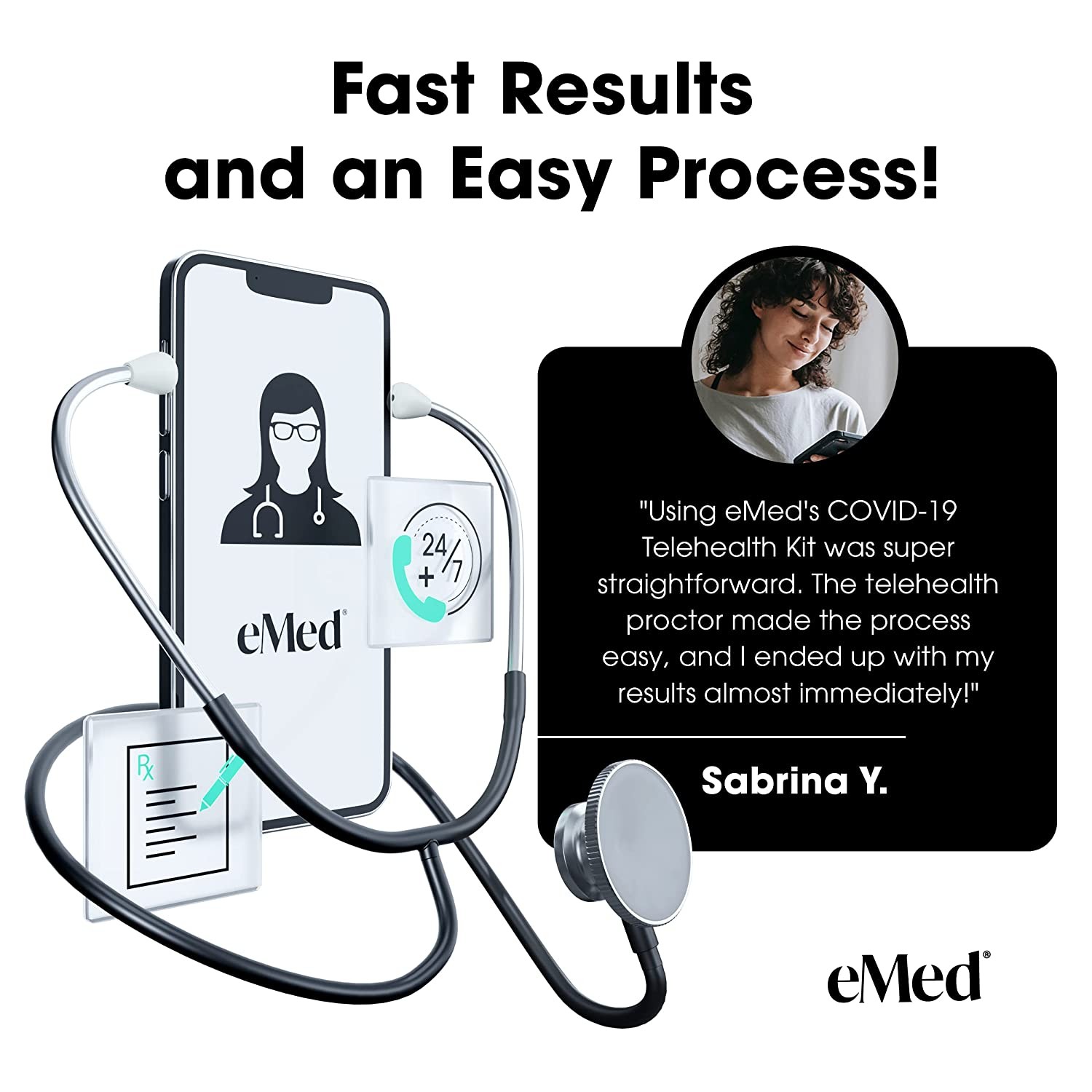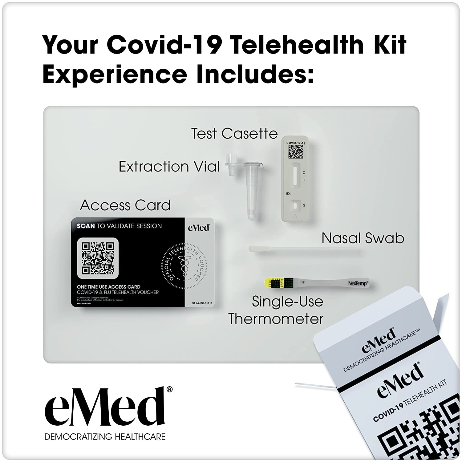 Get results in minutes: With eMed's COVID-19 Telehealth kit, everything you need is in the box. Each kit includes an access card for telehealth access, a COVID-19 rapid antigen test, and a validated lab report.