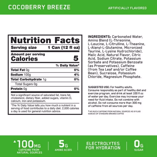 • 100 mg of caffeine per serving from natural sources like coffee bean and/or green tea extracts