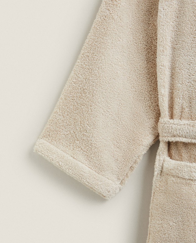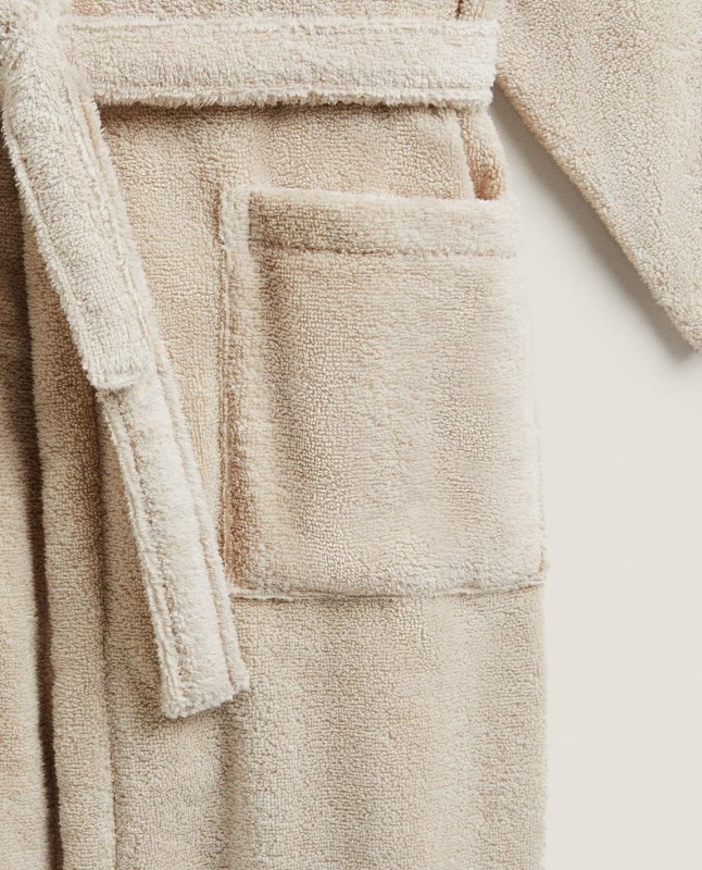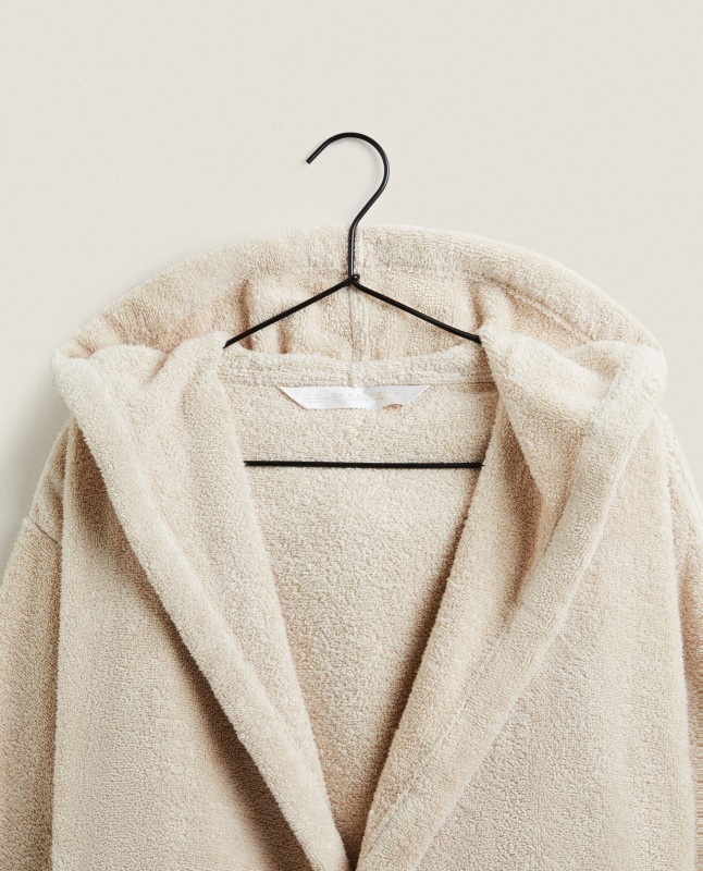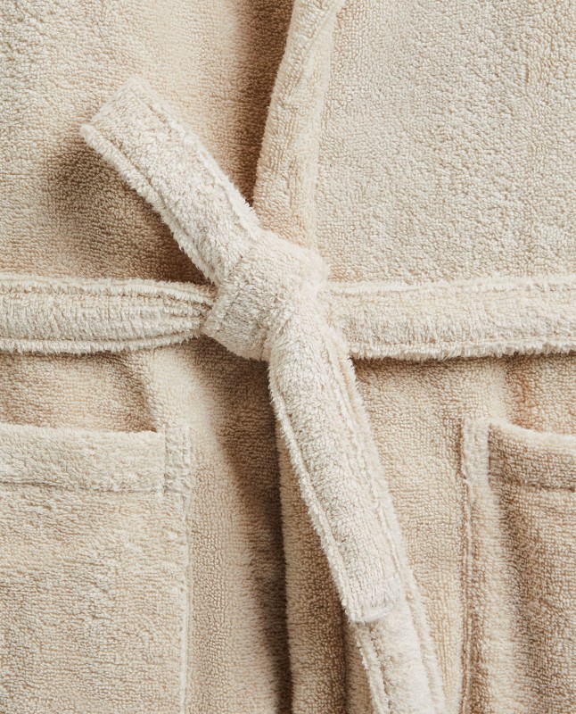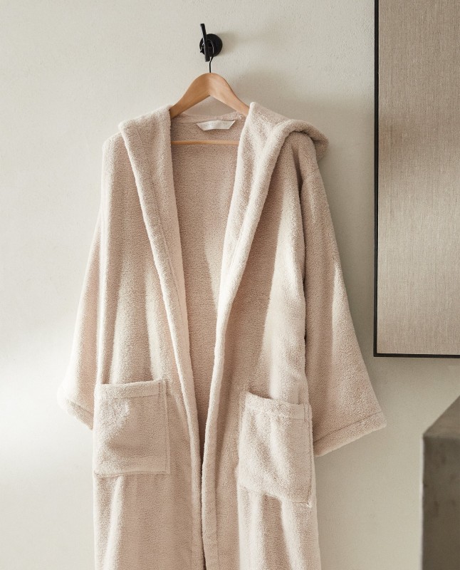 Unisex bathrobe made of an extra soft cotton with a hood, a pocket on each side and a cord around the waist, highly absorbent and quick-drying. Unisex size.