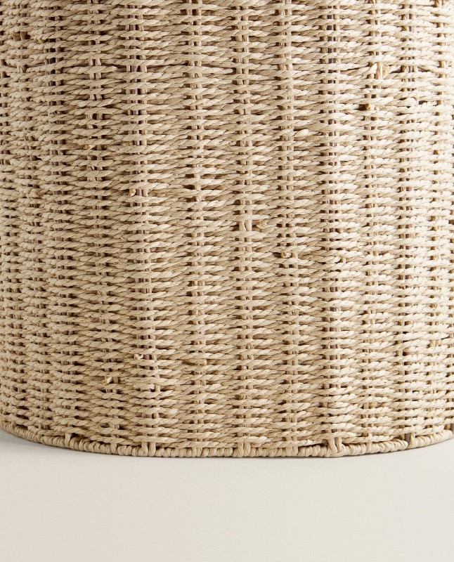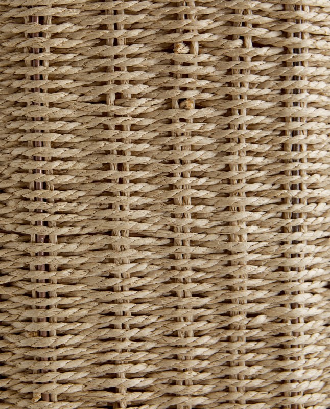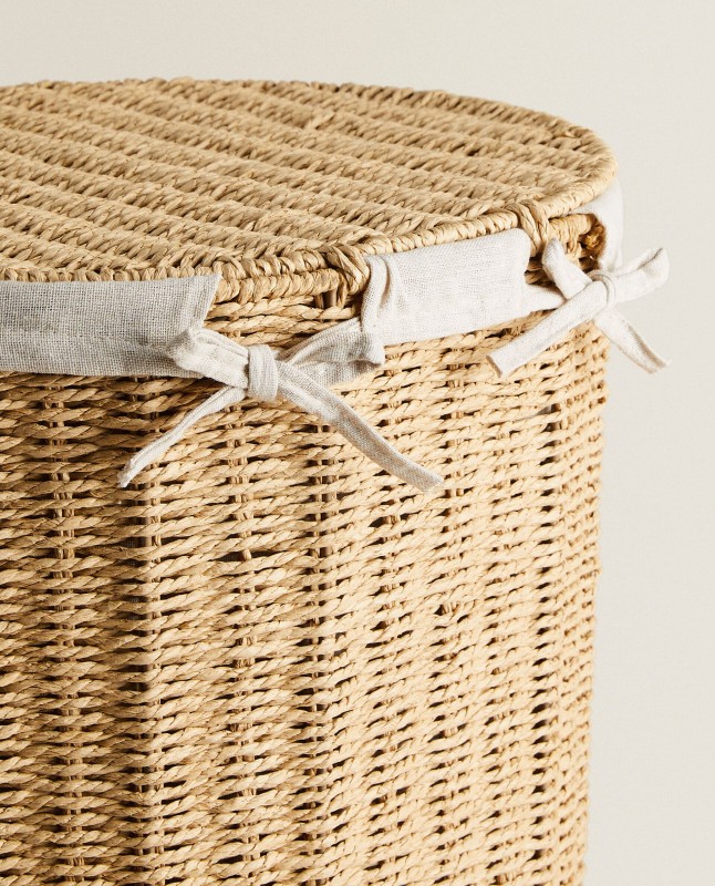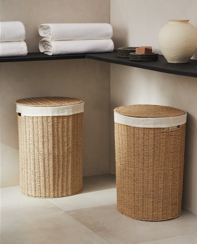 Laundry basket featuring an oval base, lid, handles, metal frame covered in resilient paper, and linen and cotton lining.Removable and washable fabric lining.
