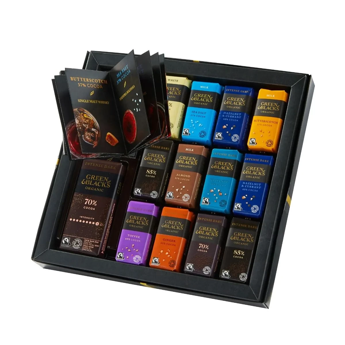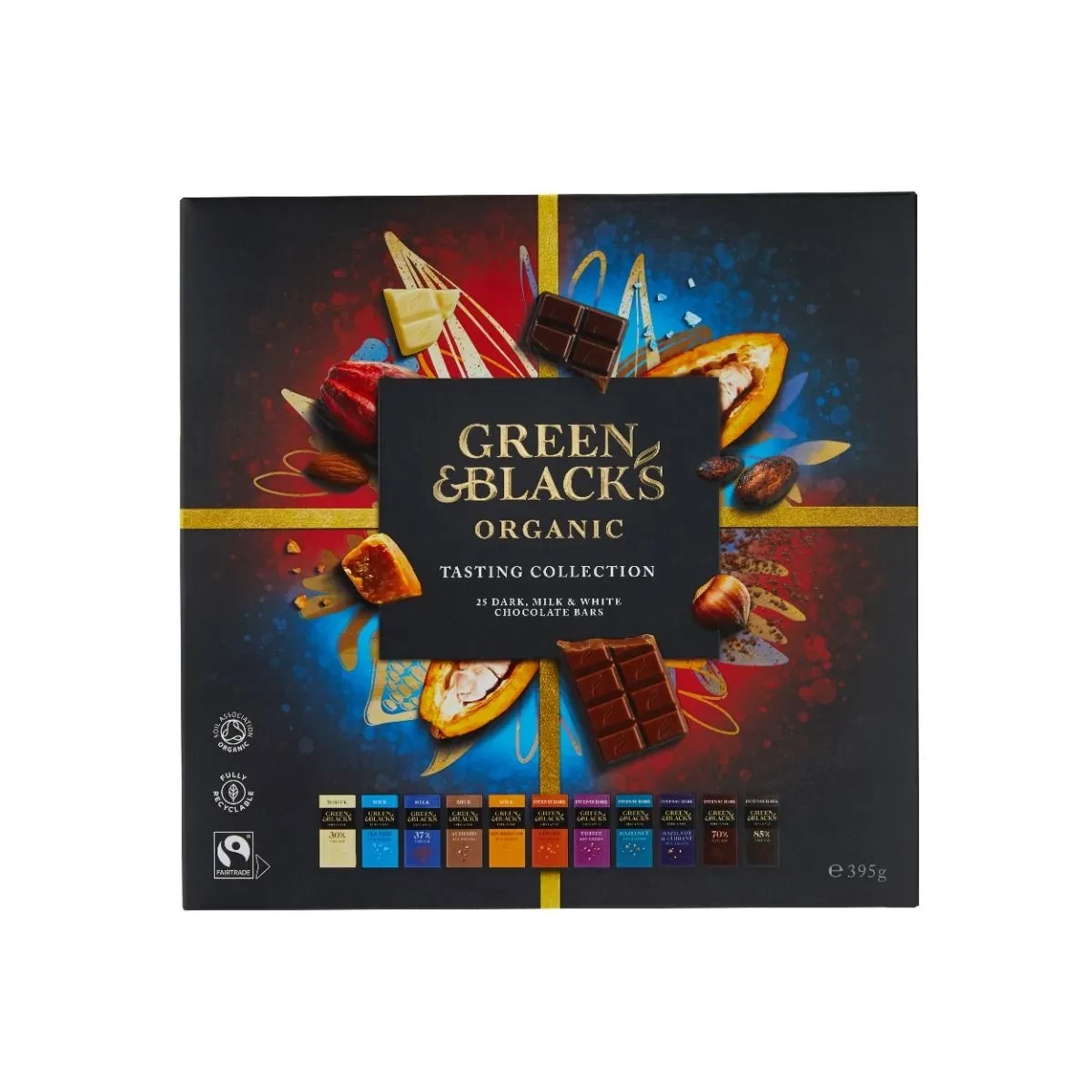 GREEN & BLACK\'S 25 ORGANIC TASTING COLLECTION DARK, MILK & WHITE CHOCOLATE BARS 395G
