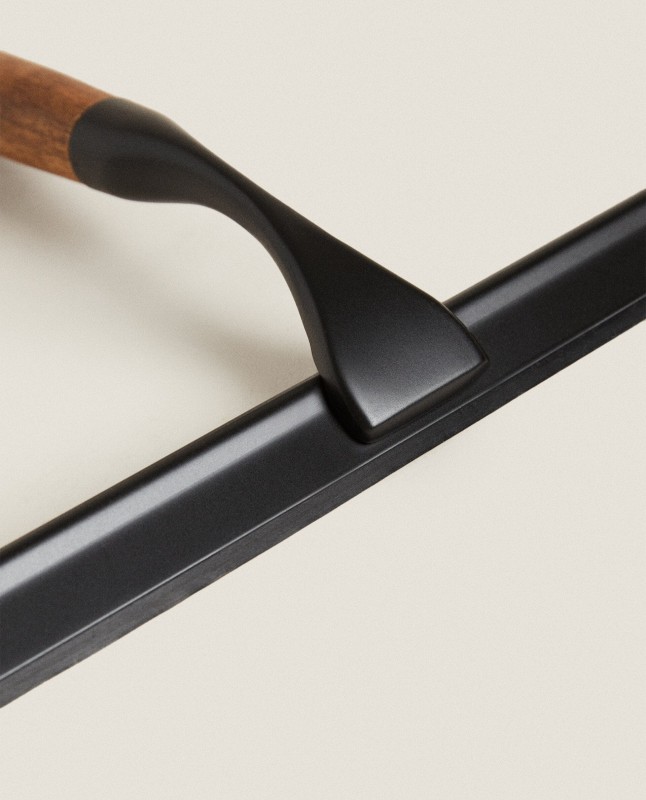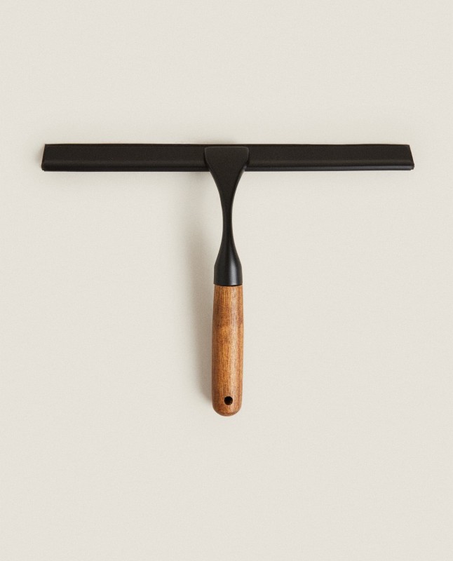 Glass cleaner with a wooden handle for showers and screens.