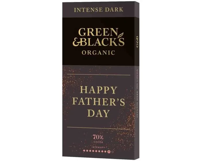 Green & Black's Father's Day organic dark chocolate gift. Green & Black's classic organic Dark 70% bar with Happy Father's Day gift sleeve alongside Dark with Ginger pieces, G& B's Organic Dark 85% bars. All delivered in Green & Black's recycled gift box.
