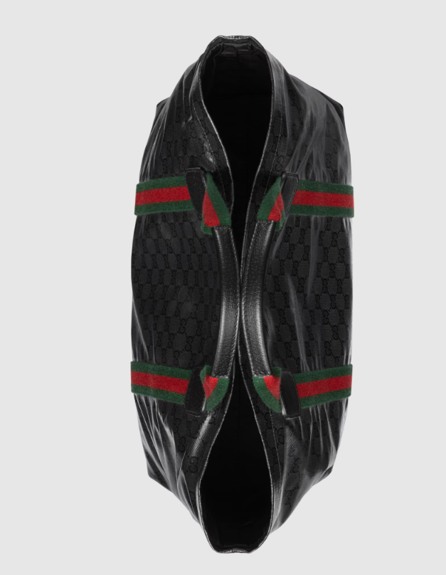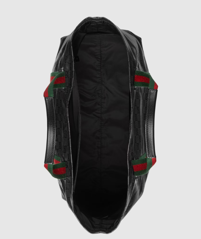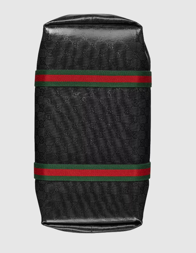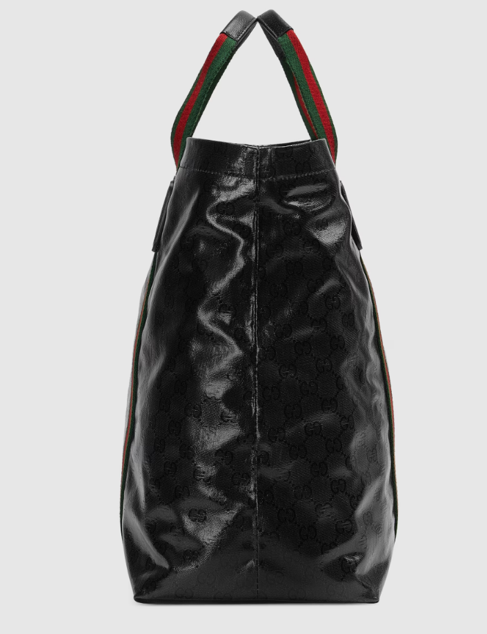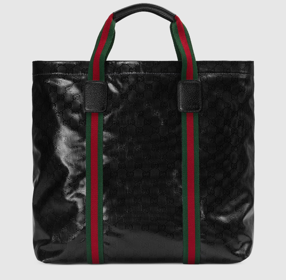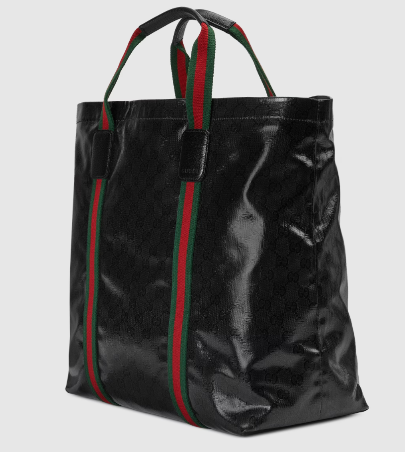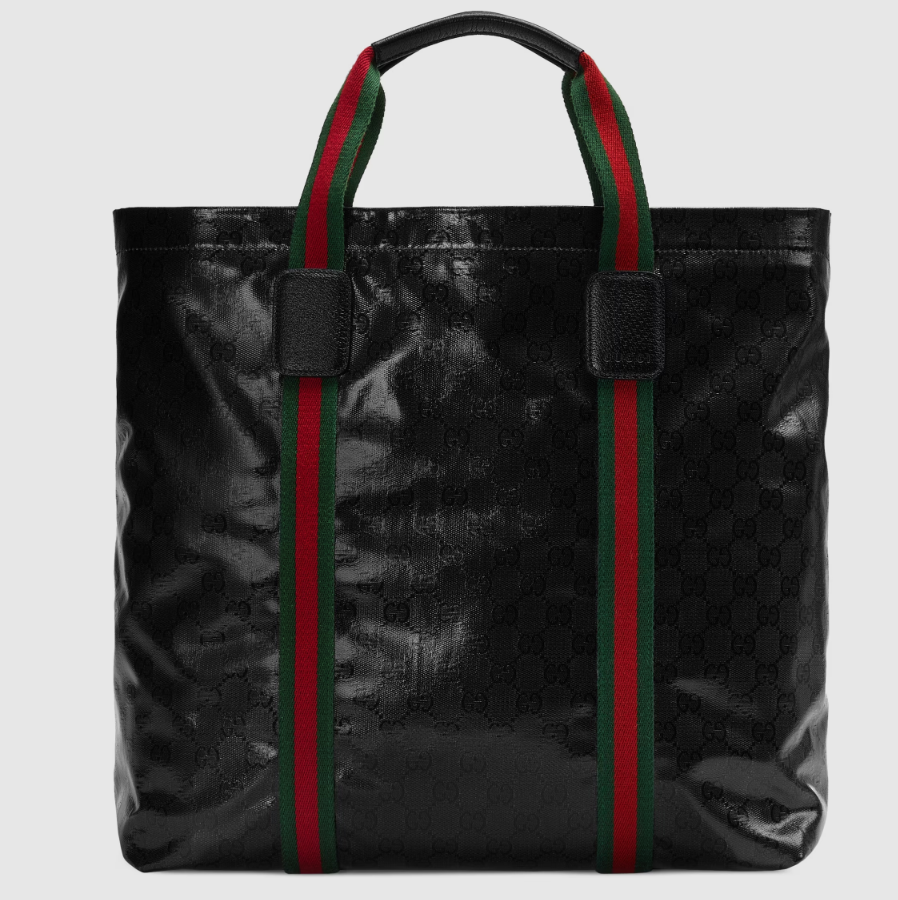 The GG Crystal canvas, with its lustrous surface and durable characteristics, lends itself well to the men's accessories line, adding a modern feel to established House designs. The emblematic green and red Web further enhances this tote bag.