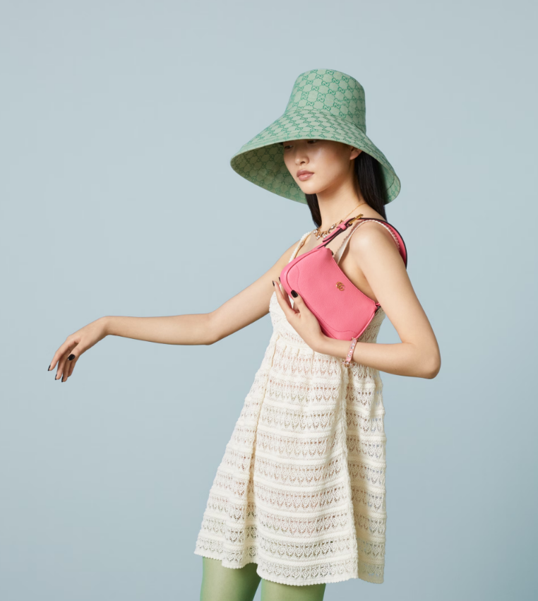 The Pre-Fall 2023 collection captures the essence of Gucci. Colors, prints, and emblems appear consistently across time-honored silhouettes, demonstrating the House's ability to reinvent signature pieces season after season. This Aphrodite shoulder bag is presented in a pop color, complemented with the unmistakable Double G hardware.