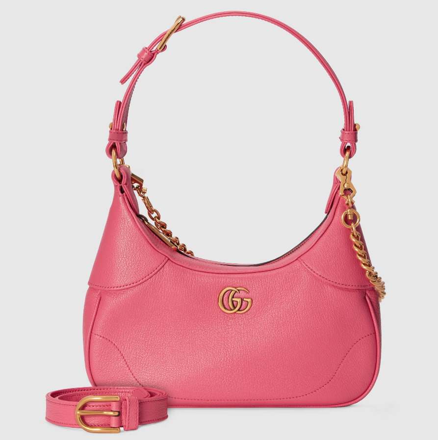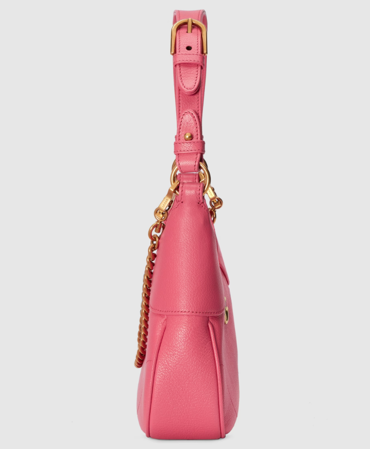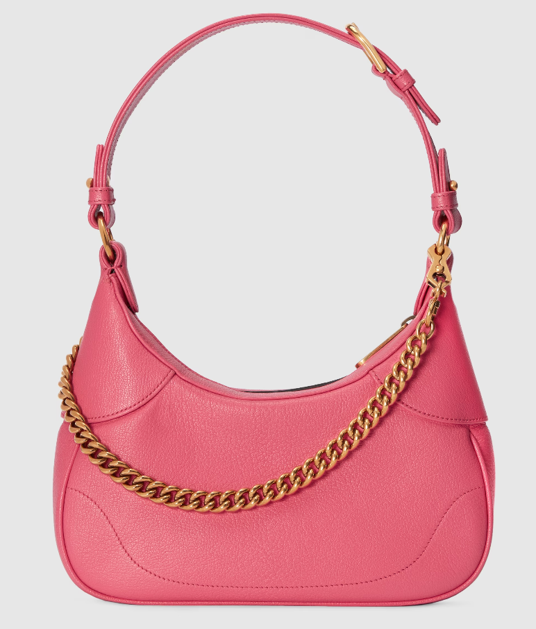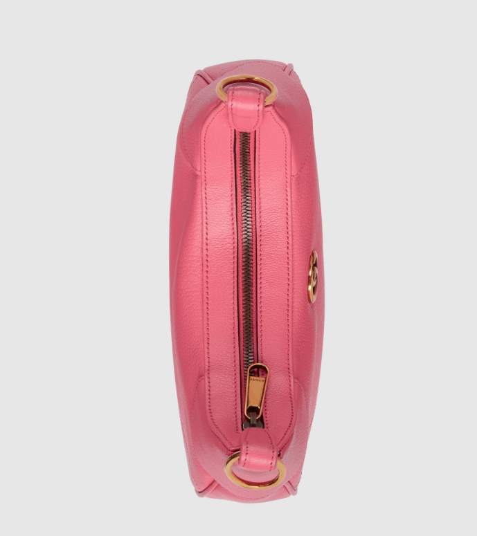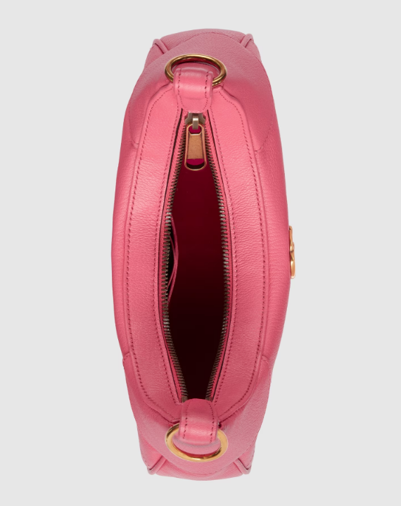 The Pre-Fall 2023 collection captures the essence of Gucci. Colors, prints, and emblems appear consistently across time-honored silhouettes, demonstrating the House's ability to reinvent signature pieces season after season. This crescent-shaped shoulder bag is presented in pink soft leather and enriched with the instantly recognizable Double G.