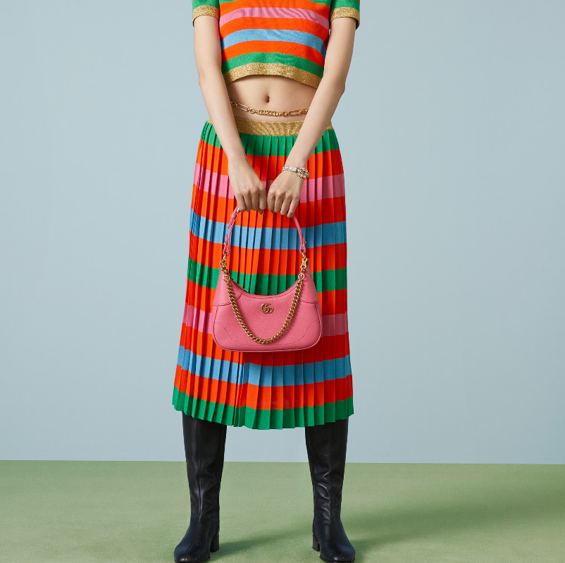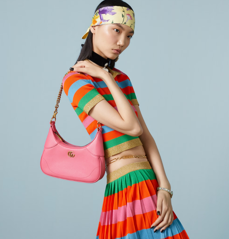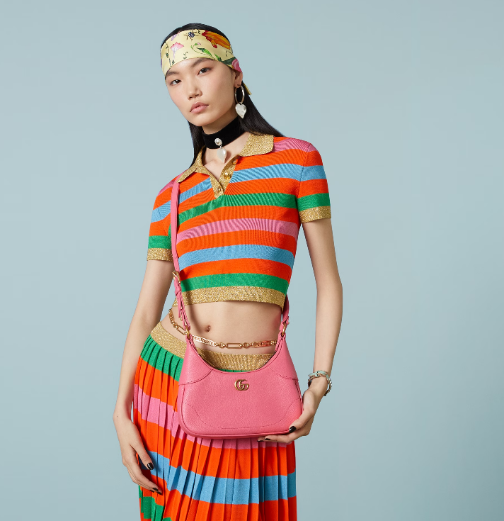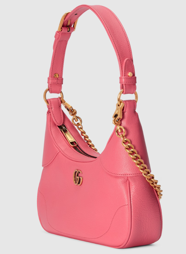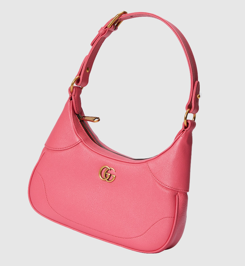 The Pre-Fall 2023 collection captures the essence of Gucci. Colors, prints, and emblems appear consistently across time-honored silhouettes, demonstrating the House's ability to reinvent signature pieces season after season. This crescent-shaped shoulder bag is presented in pink soft leather and enriched with the instantly recognizable Double G.