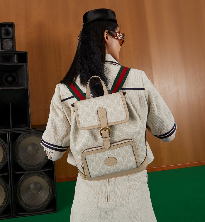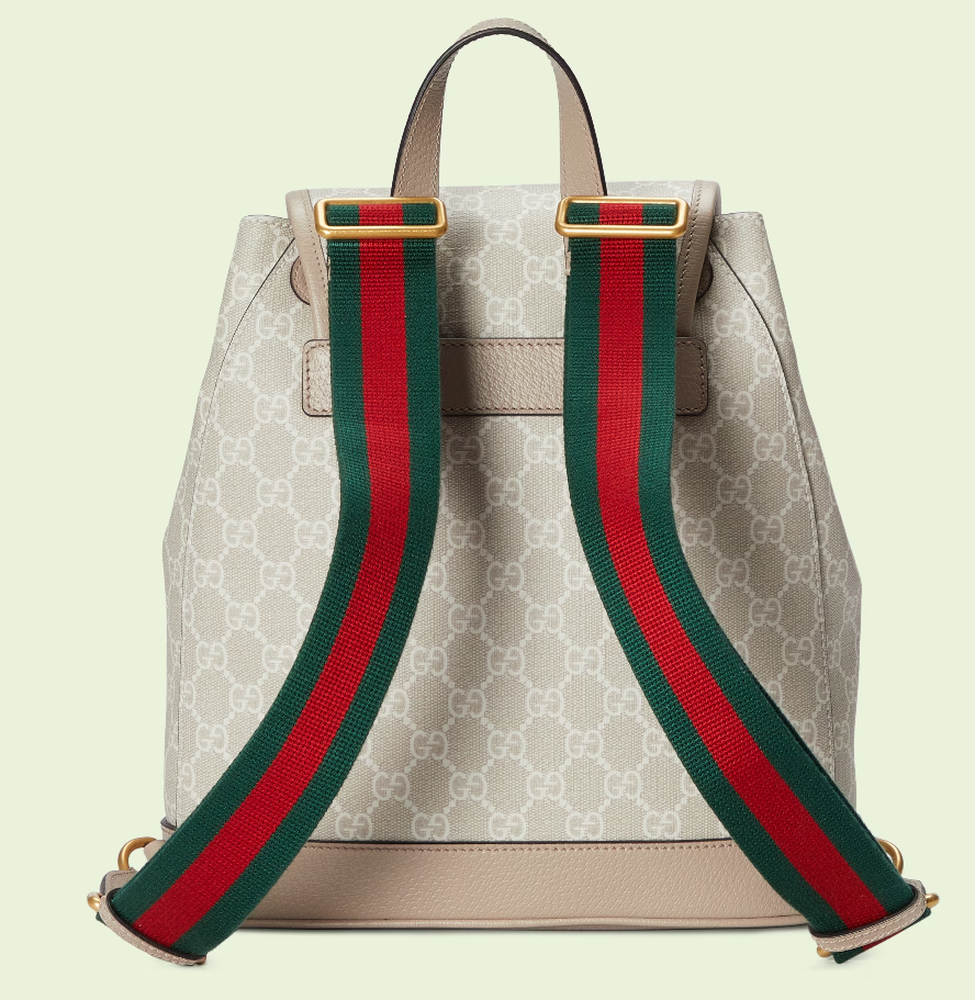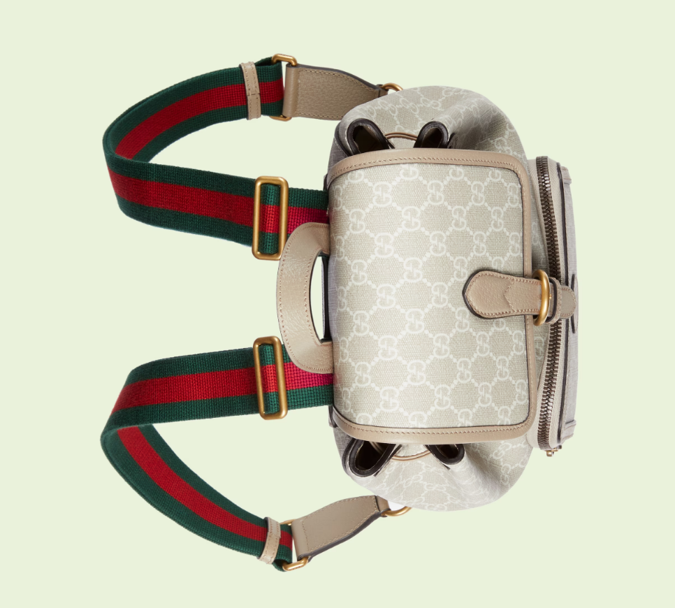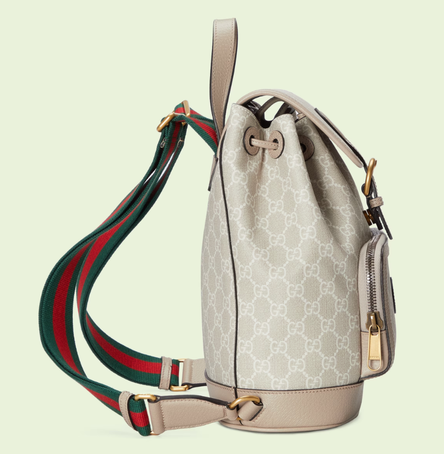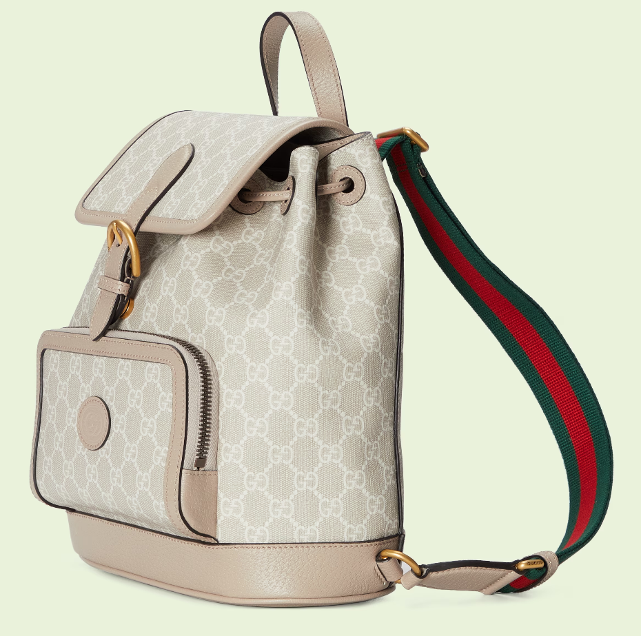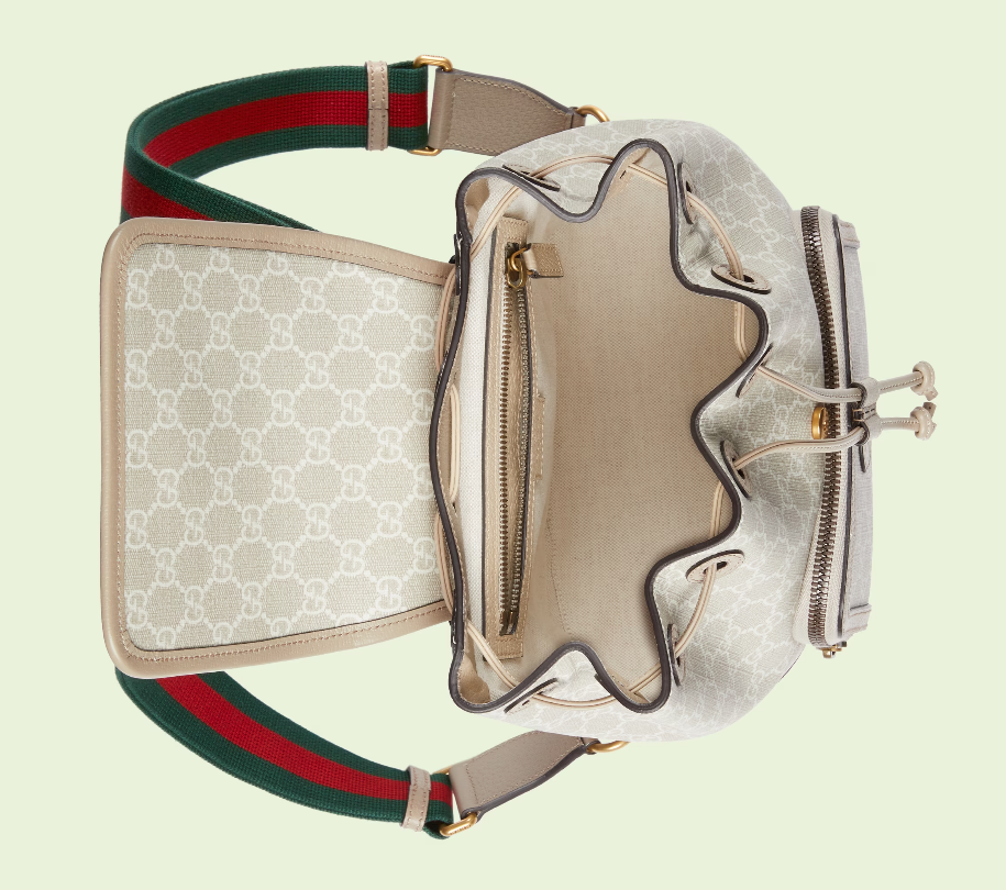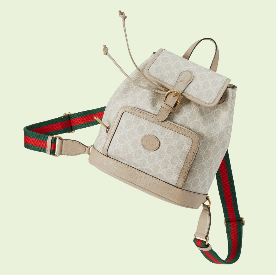 An archival design from the 1930s inspired the GG Supreme canvas, now one of the House's most emblematic materials. Traditionally presented in beige and ebony, it appears here in a beige and white combination, an ode to timeless pieces and everlasting design. The backpack is complete with an oatmeal leather trim and an Interlocking G tag.