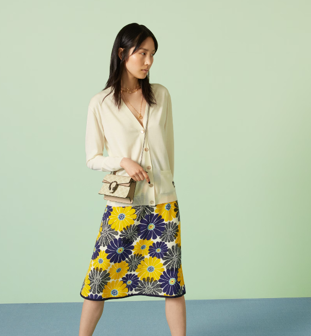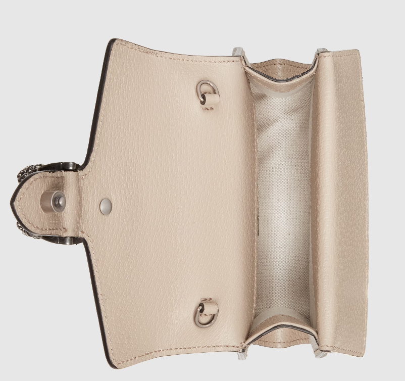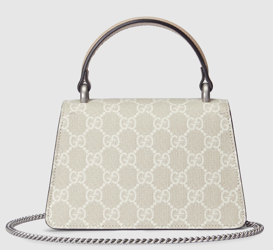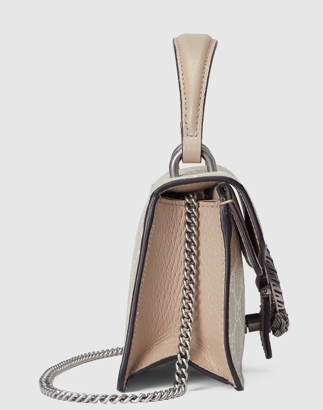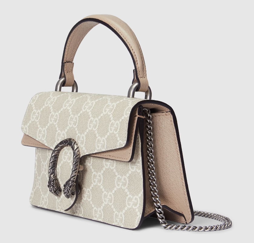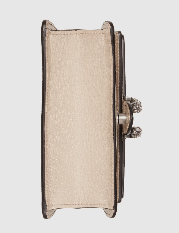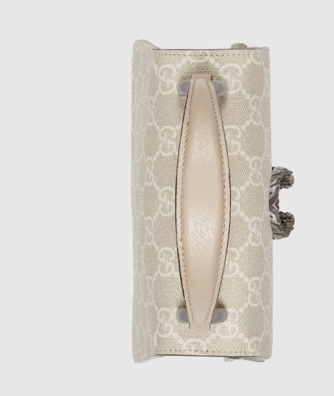 Presented in a mini dimensions for Pre-Fall 2023, this Dionysus bag in beige and white GG Supreme canvas is defined by the tiger head spur closure, a beloved symbol of the House. An oatmeal leather trim adds depth to the design, introducing tonal elements and contrasting textures.
