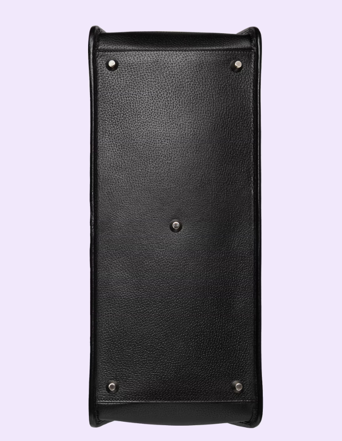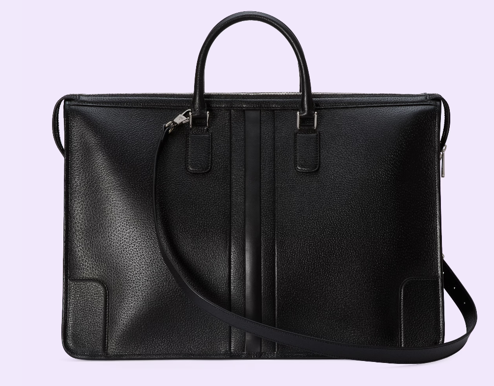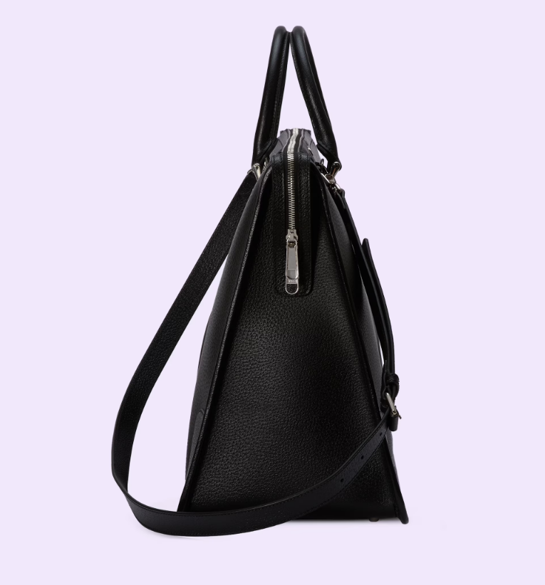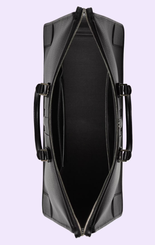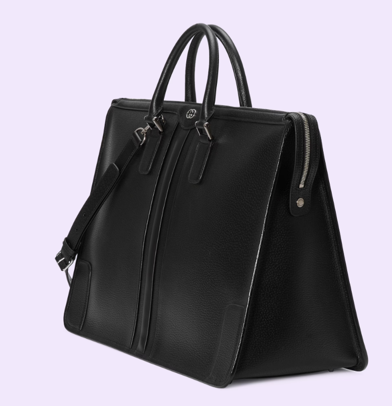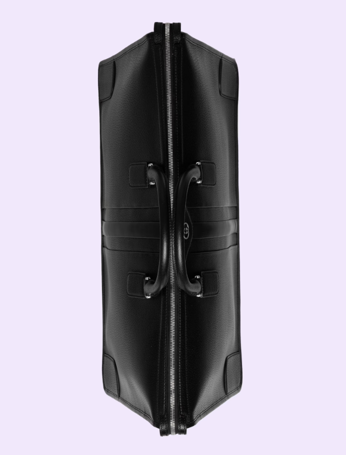 Gucci's latest travel selection takes its roots from 1900s; the heyday of luxury luggage. With a more formal silhouette and archival design details such as the Interlocking G, the offering has a distinctly refined feel. This black leather duffle bag is complete with a miniature variation of the House logo, reflected also in the interior lining.