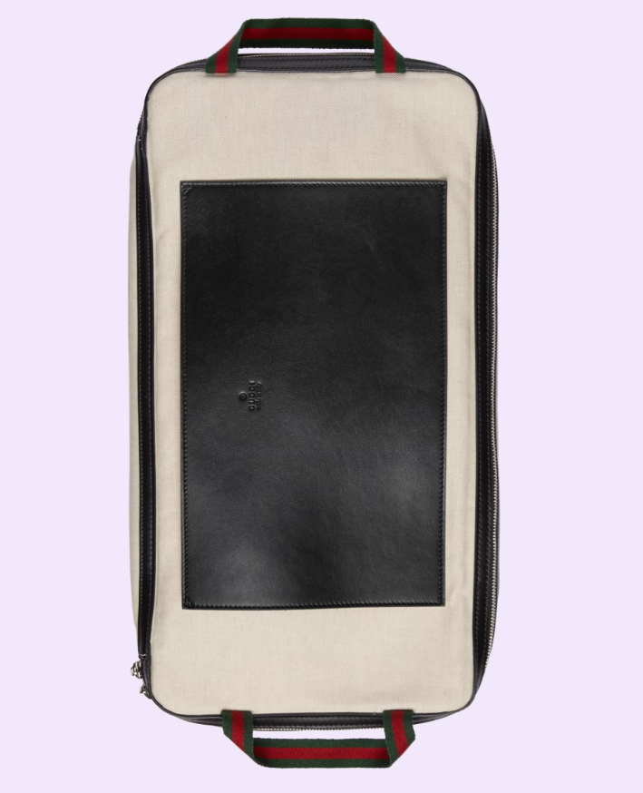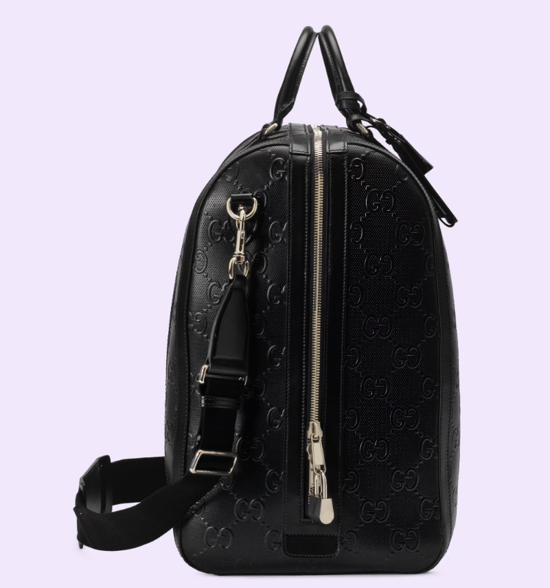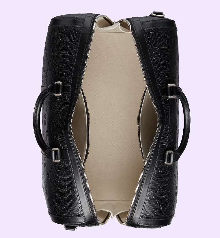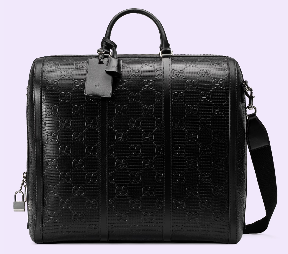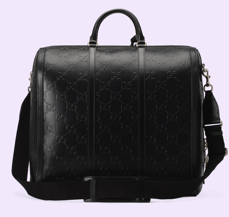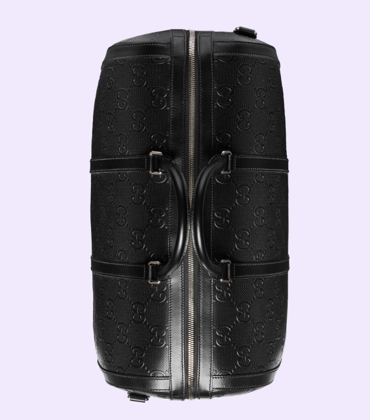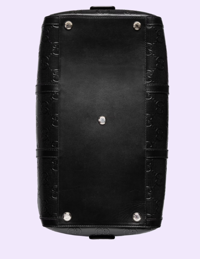 Connecting the House's past and present, archival codes appear in new ways with a contemporary twist. Playing with textures and materials the Guccio Gucci's monogram appears an embossed detail against a black leather base. Duffle bags continue to be a signature Gucci accessory, enriching the latest travel line.