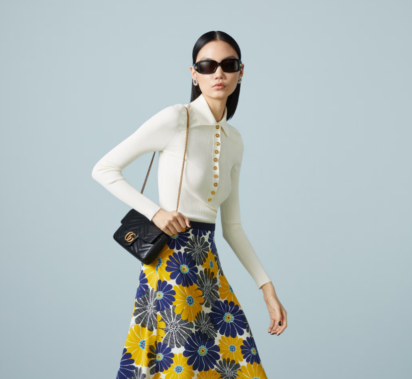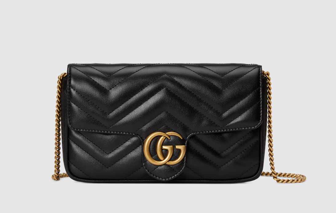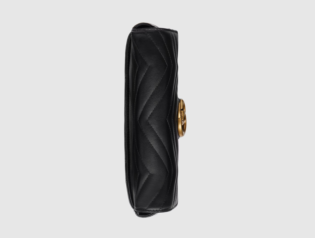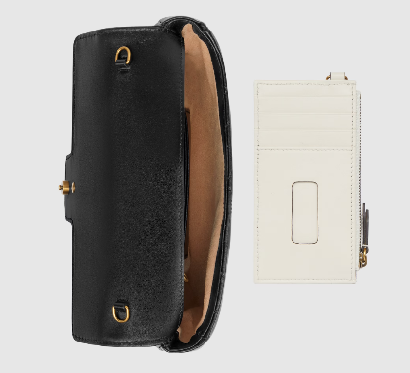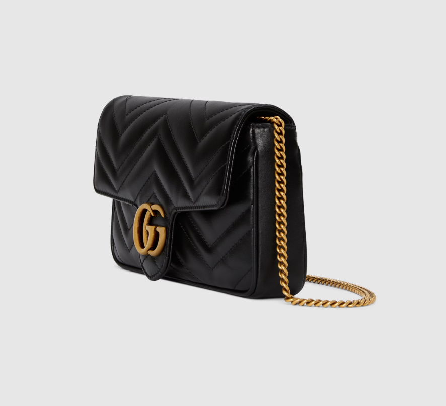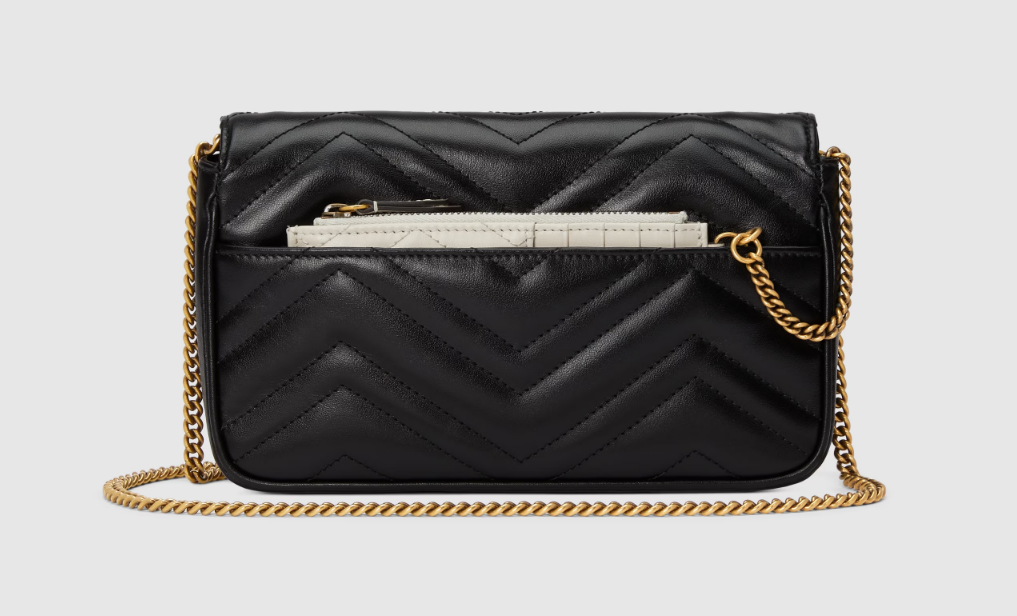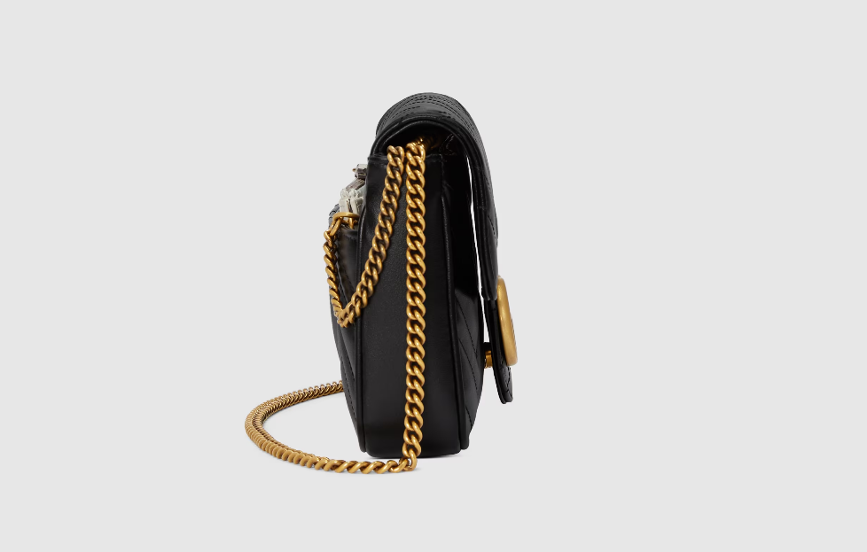 The Double G hardware brings the past into the House's present with the notion that a cherished wardrobe is enriched by items that can be worn season after season. This mini bag with a chain strap is crafted from the signature matelassé chevron leather in black, while the inside features a contrasting white leather card case that can be detached.