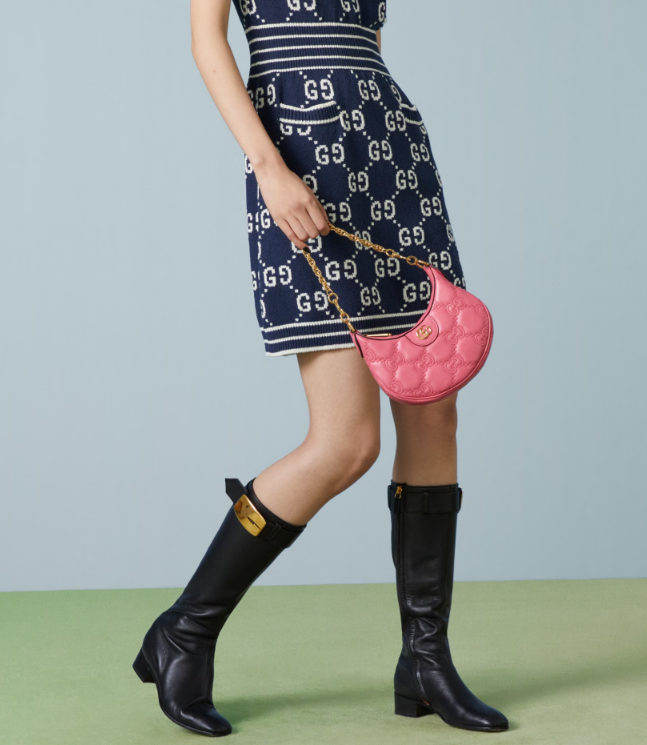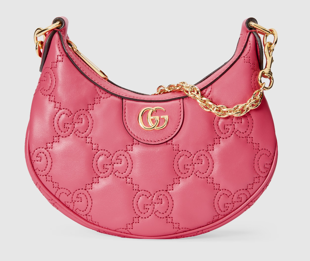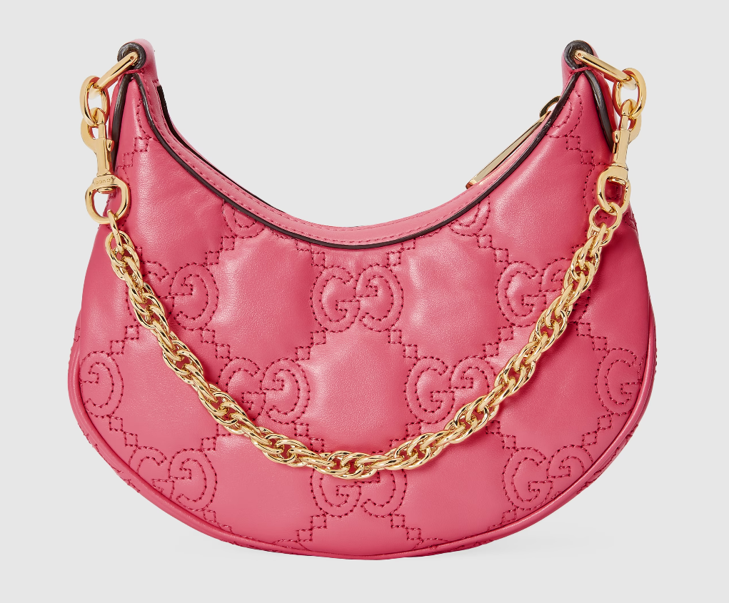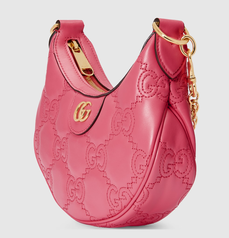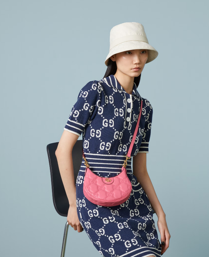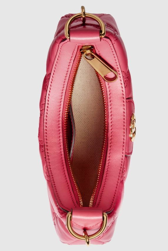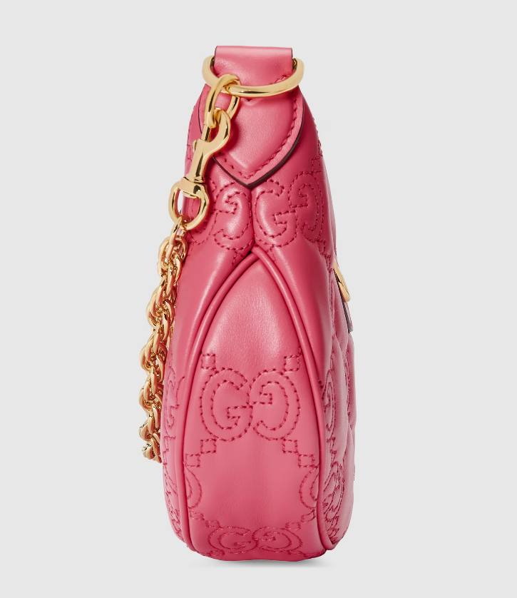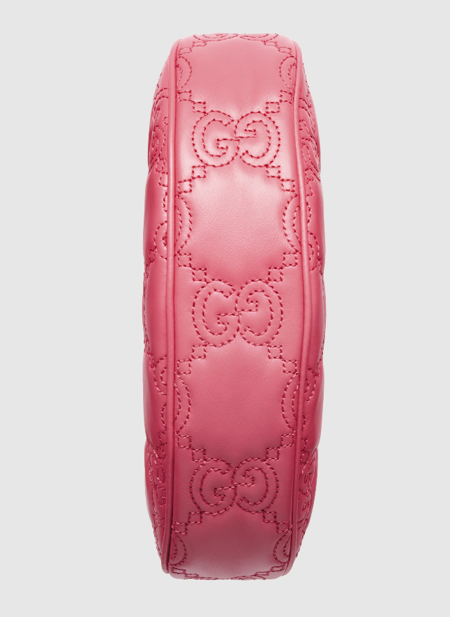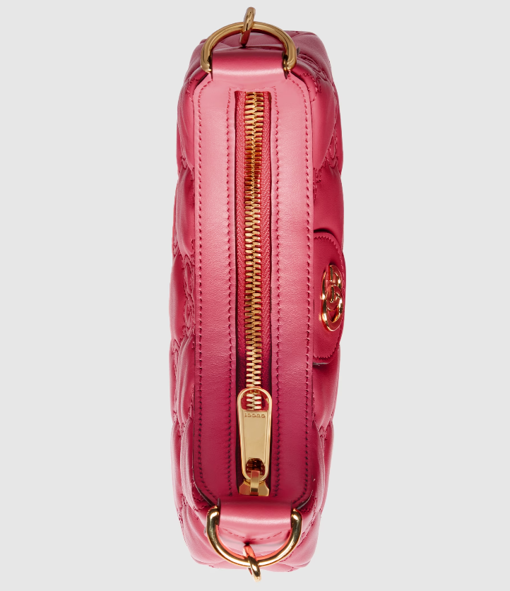 The Pre-Fall 2023 collection captures the essence of Gucci. Colors, prints, and emblems appear consistently across time-honored silhouettes, demonstrating the House's ability to reinvent signature pieces season after season. This compact mini bag is presented in pink GG Matelassé leather and further enriched with a Double G emblem.