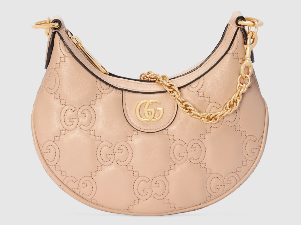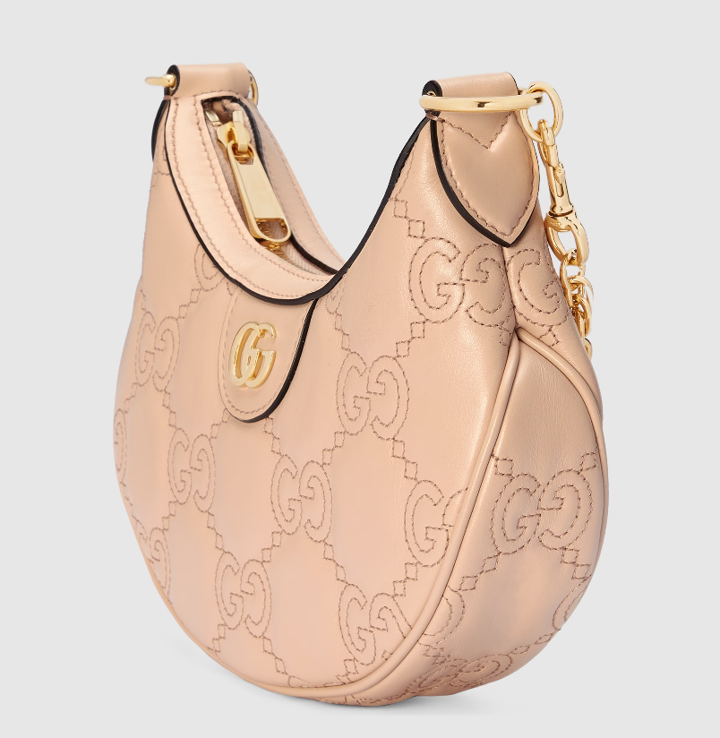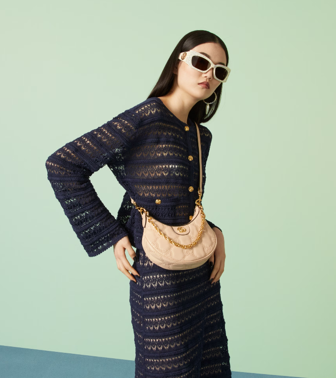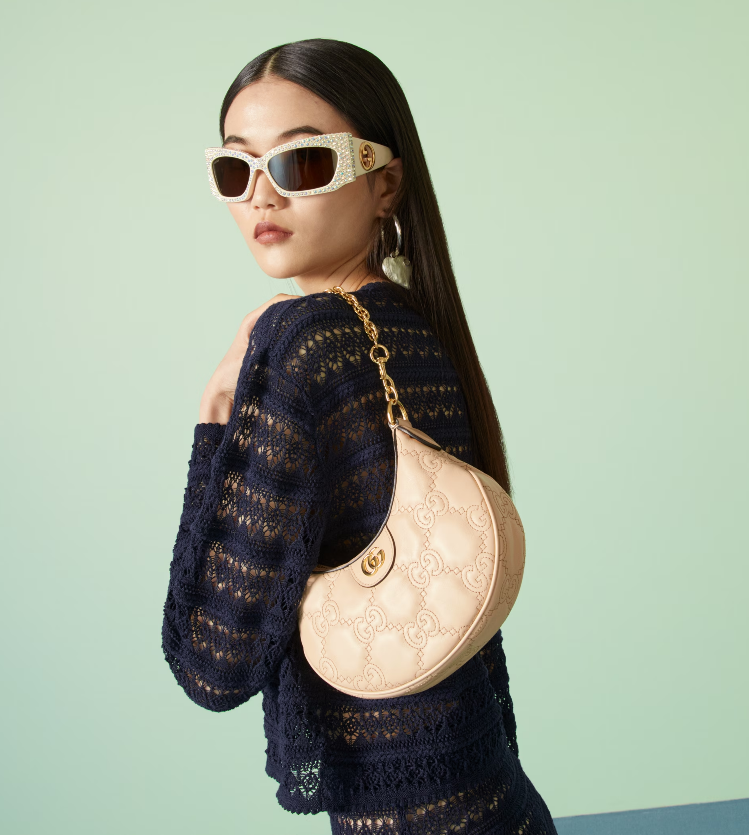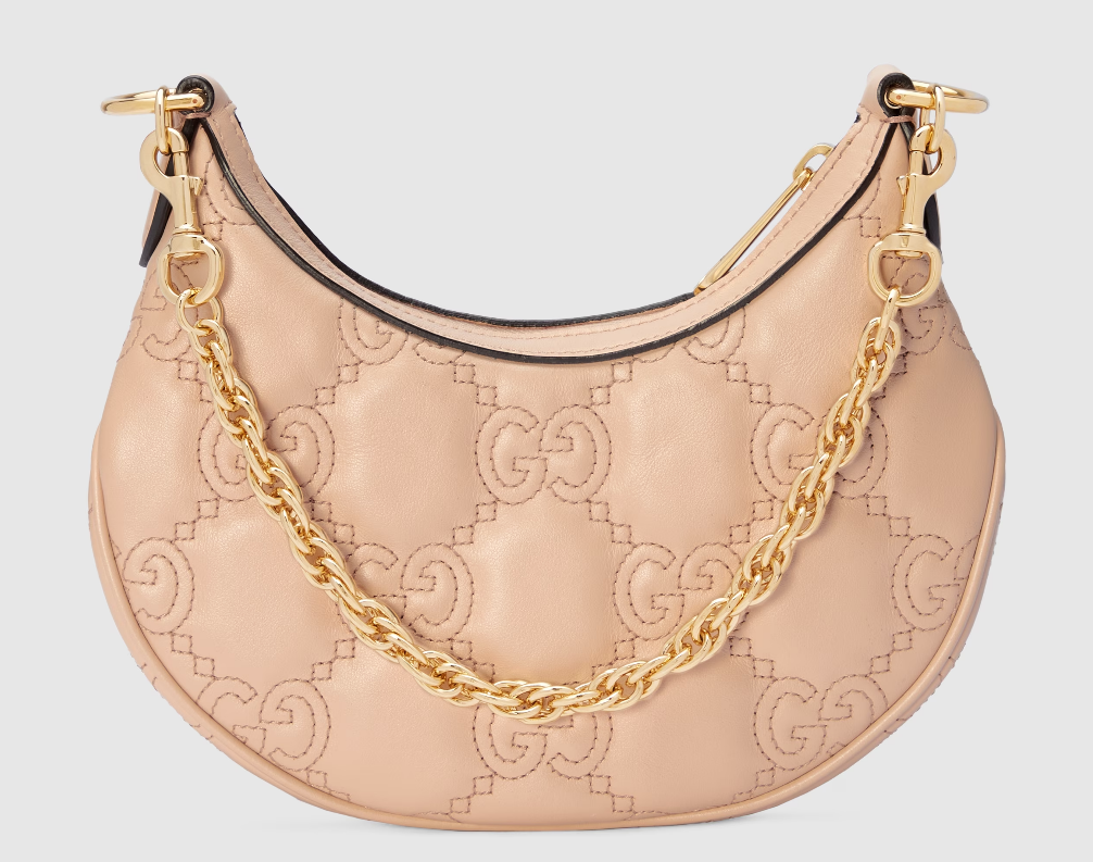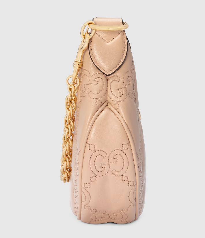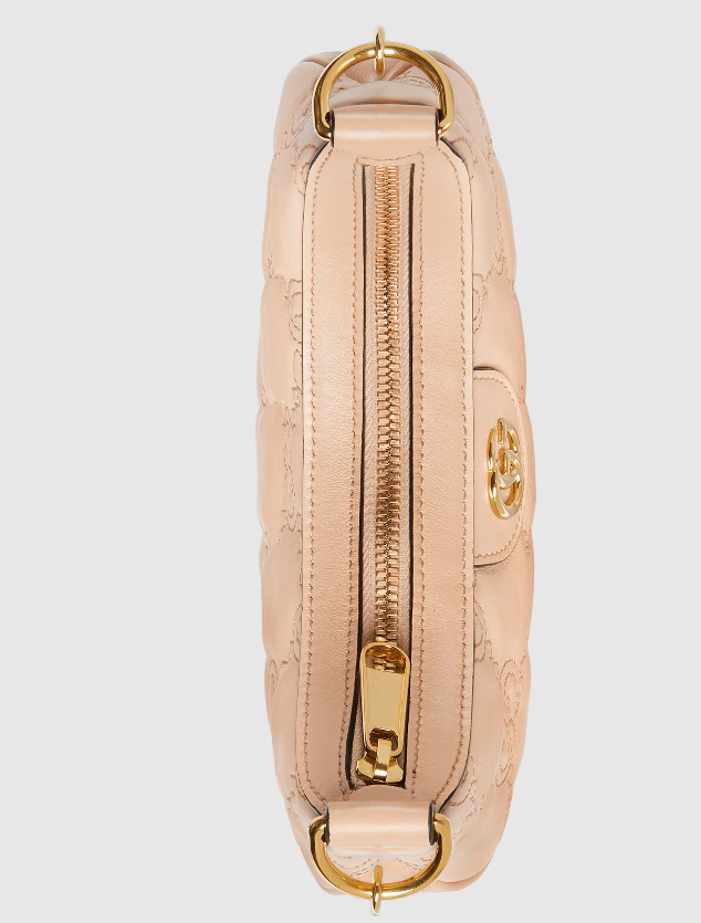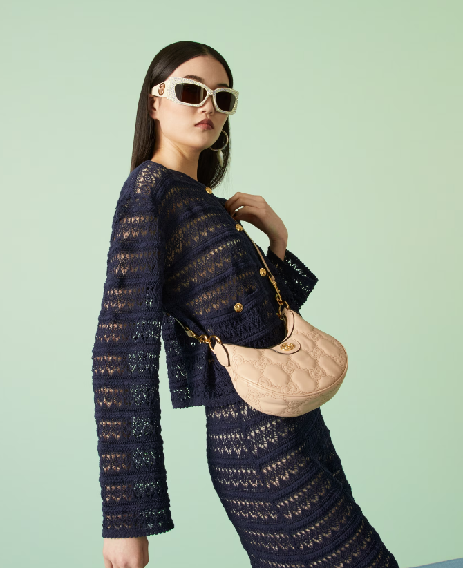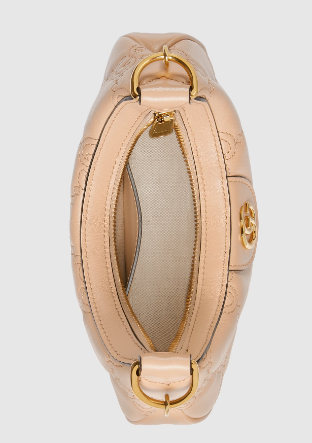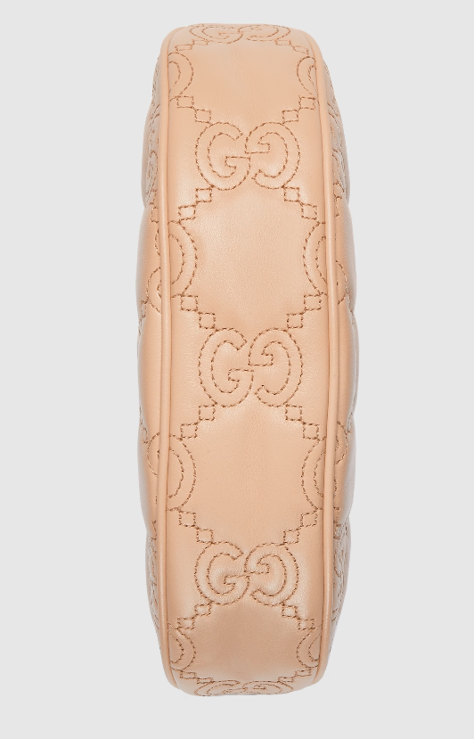 The Pre-Fall 2023 collection captures the essence of Gucci. Colors, prints, and emblems appear consistently across time-honored silhouettes, demonstrating the House's ability to reinvent signature pieces season after season. This compact mini bag is presented in beige GG Matelassé leather and further enriched with a Double G emblem.