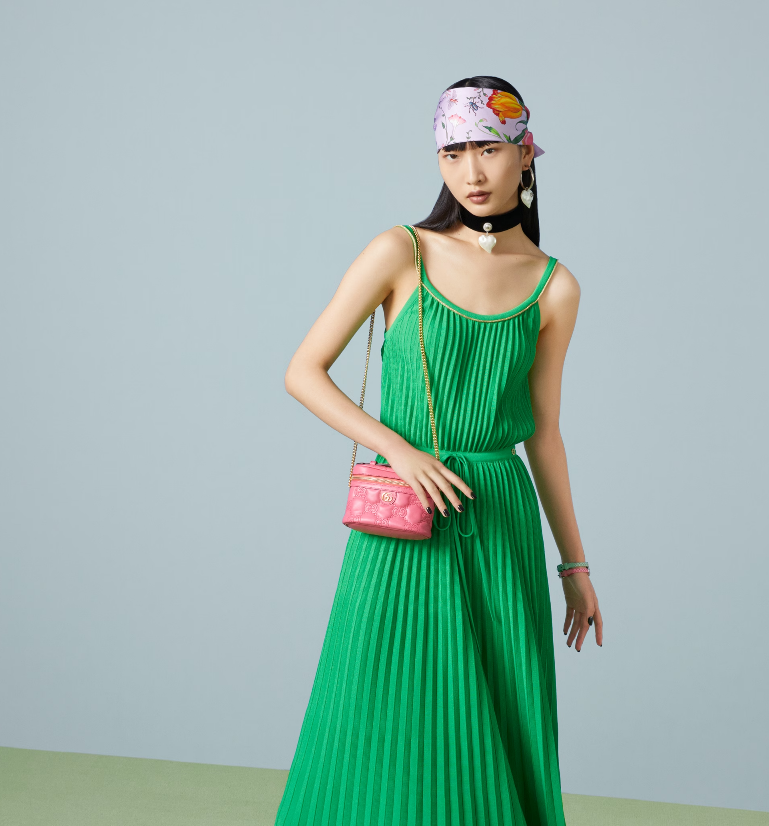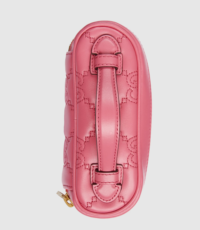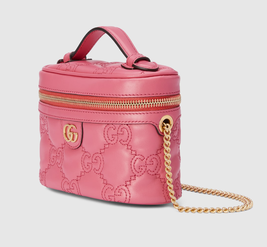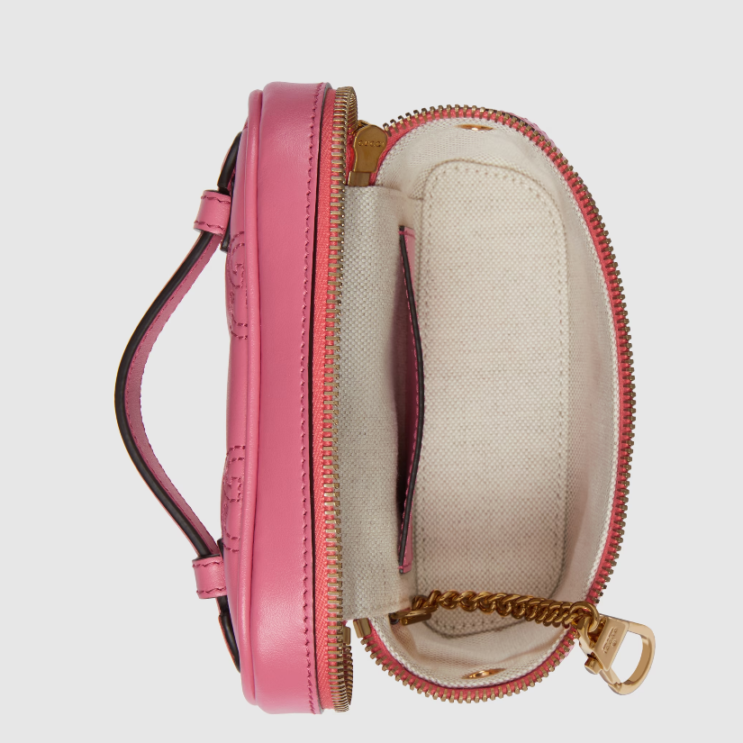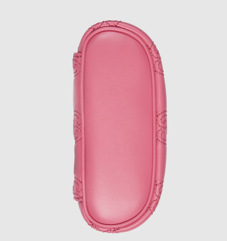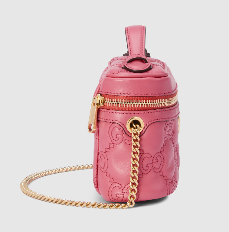 Defined by a textured geometric version of the House emblem, the GG Matelassé leather has come to enrich a series of signature small leather goods. This top handle mini bag with a chain shoulder strap is brought to life by a vibrant pink shade of the now-renowned material.