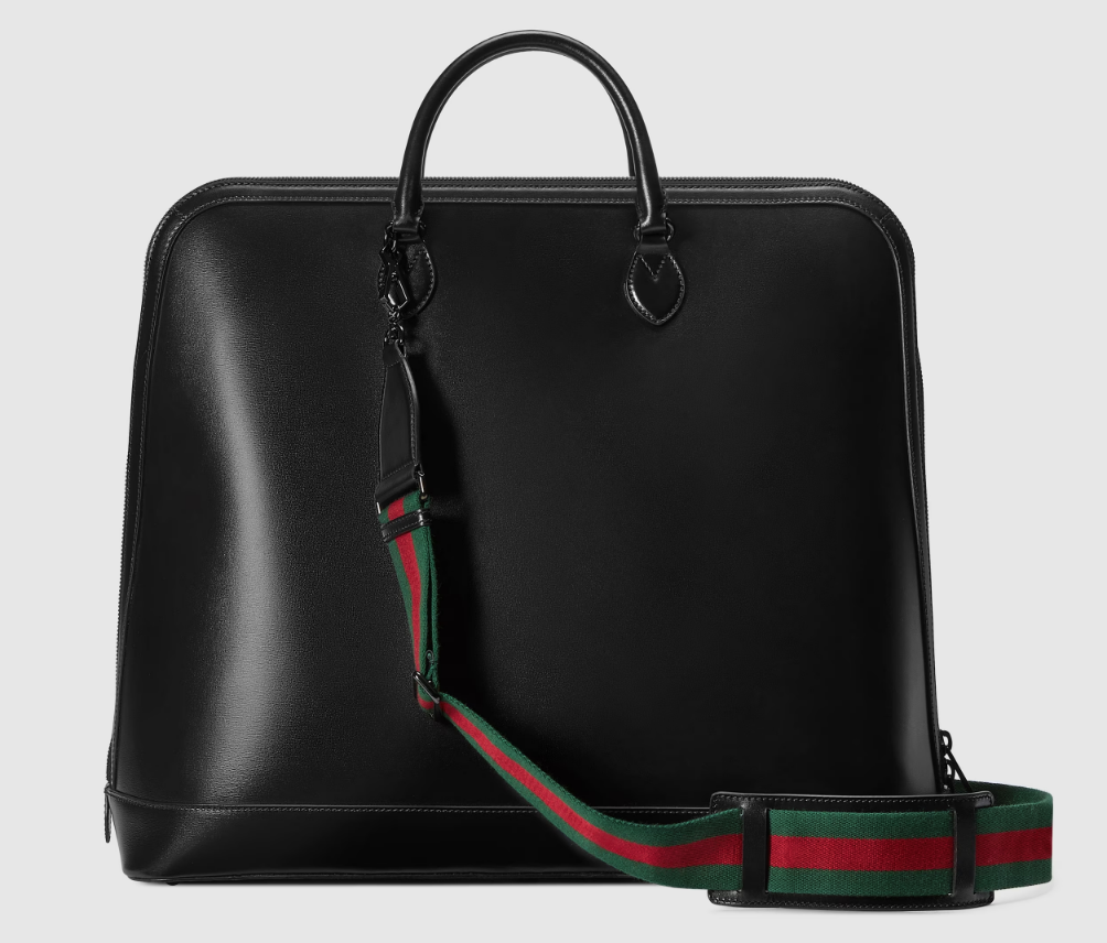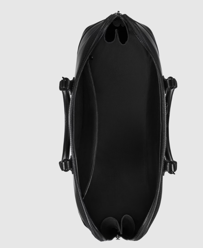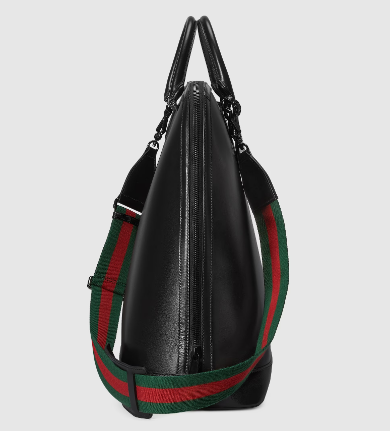 Sporting an elegant and refined aesthetic, some of Gucci's most beloved leather bags are reimagined in an all black tonal color, such as this Gucci Horsebit 1955 duffle bag. The green and red Web stripe appears as part of the strap attachment, adding an archival touch to the contemporary silhouette.