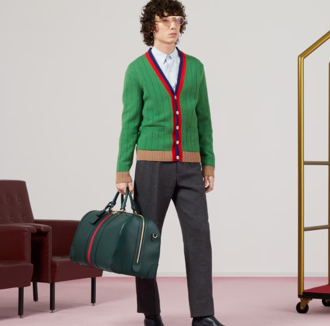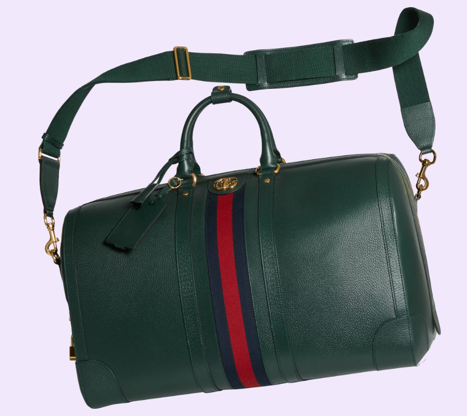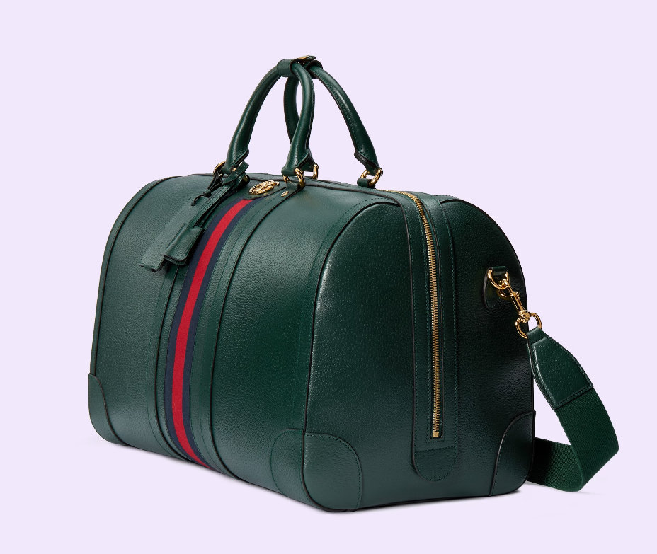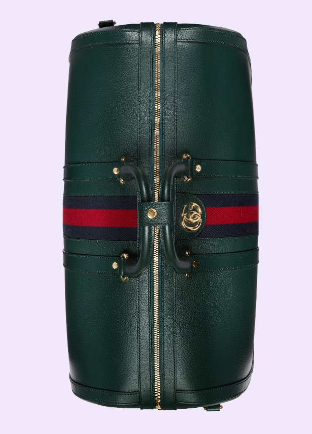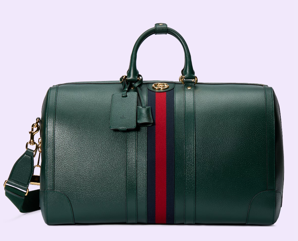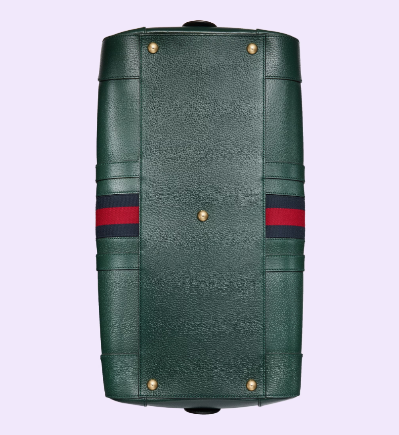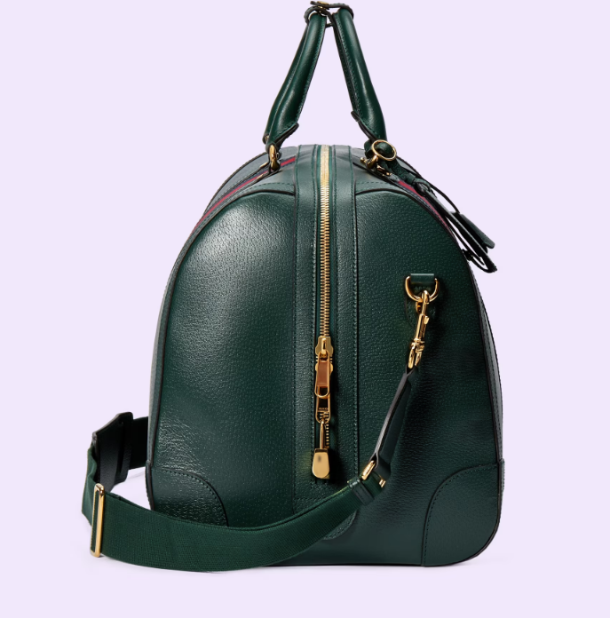 The Gucci color palette is constantly evolving to include more refined hues. New colorways and combinations result in the reinvention of signature styles with a contemporary feel. This Gucci Savoy duffle bag appears in a unique green leather, complete with a gold-toned Double G hardware and the Web stripe.