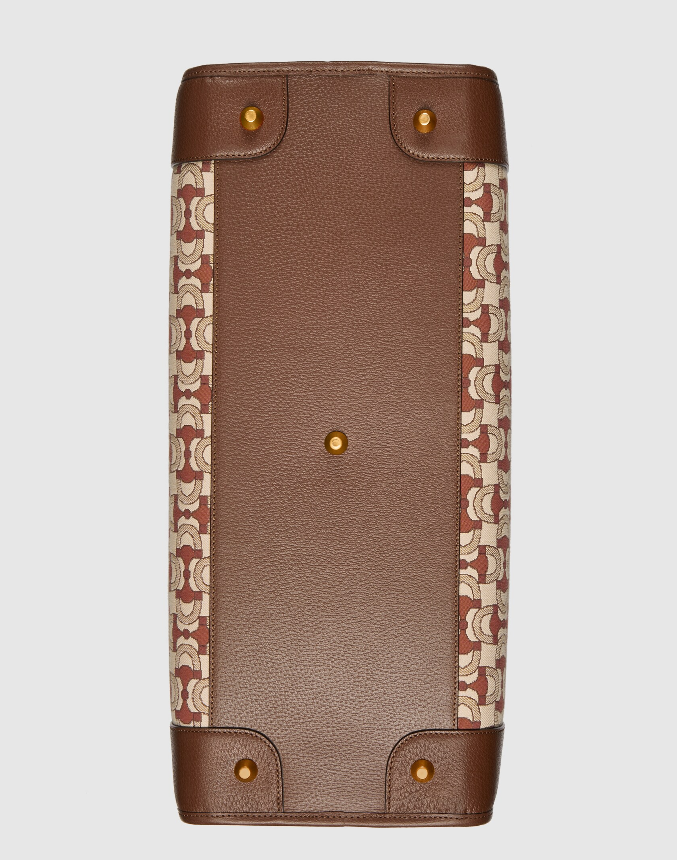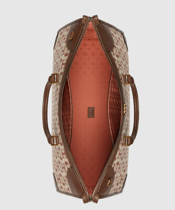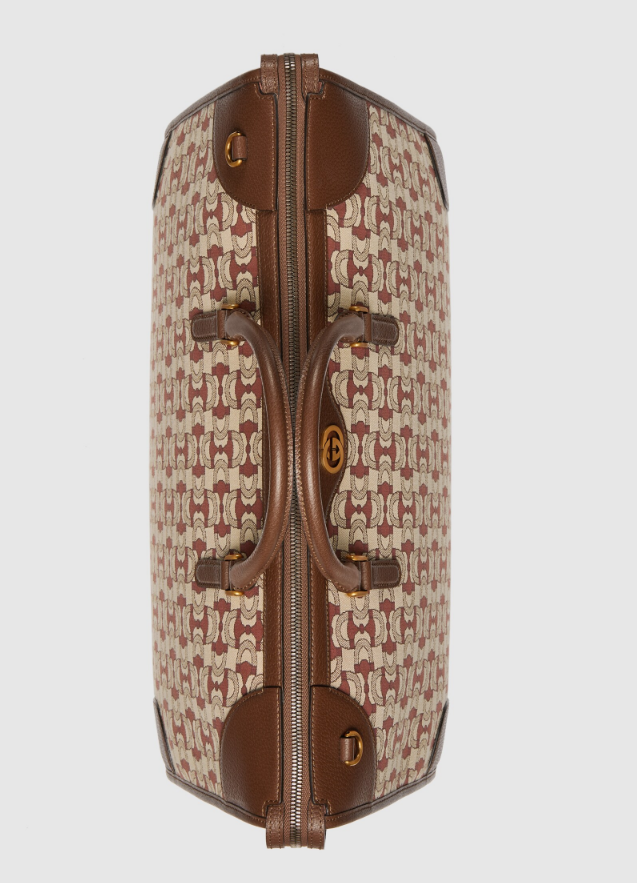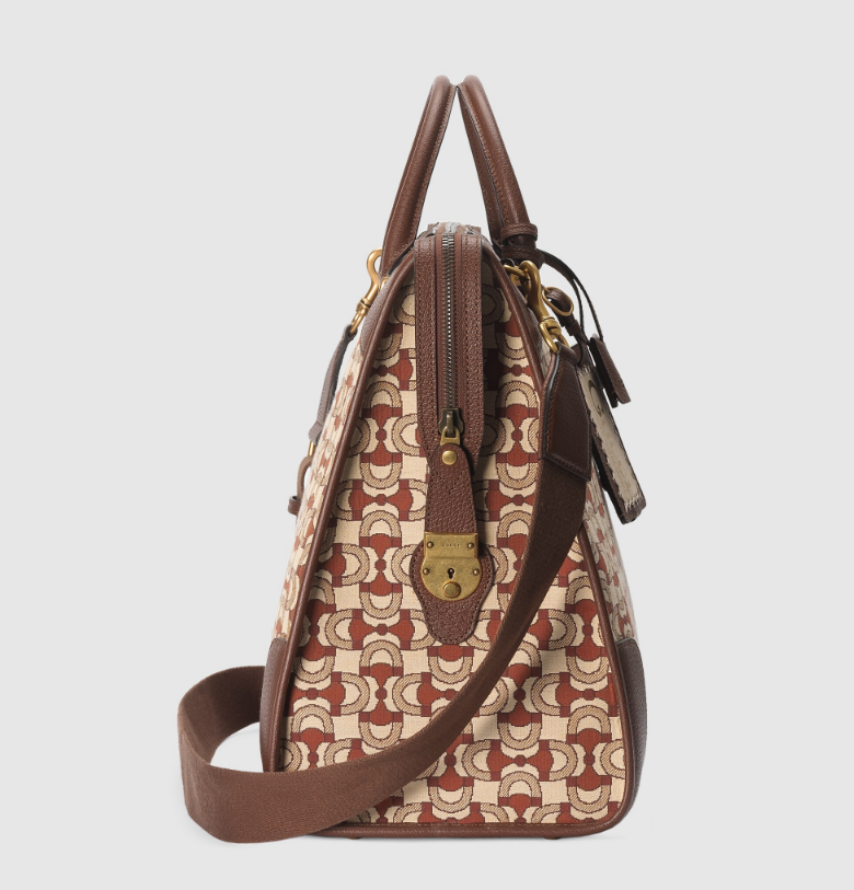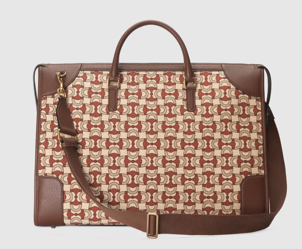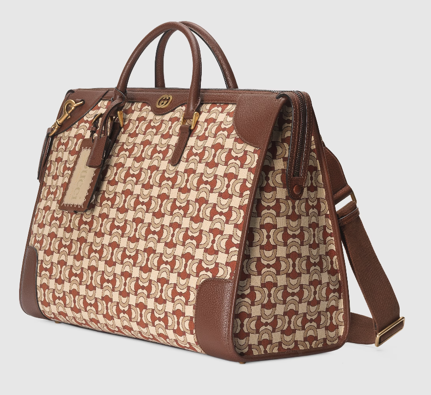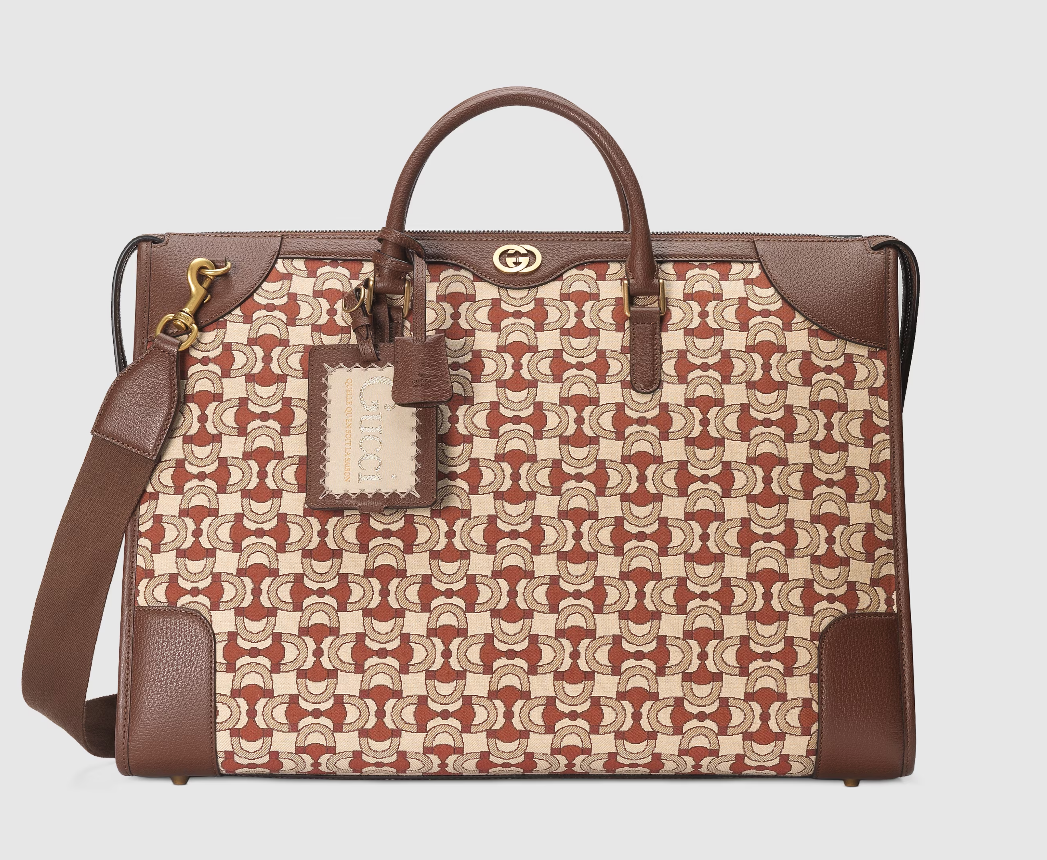 Blending seamlessly with the contemporary for an updated yet never-out-of-style wardrobe, the luggage line presents formal leather pieces with an unexpected animation. Borrowed from the ready-to-wear selection, an allover Horsebit jacquard decorates this duffle, complete with a brown leather trim. A Gucci 'Quelle qu'en soit la saison' ID tag appears alongside the logo hardware.