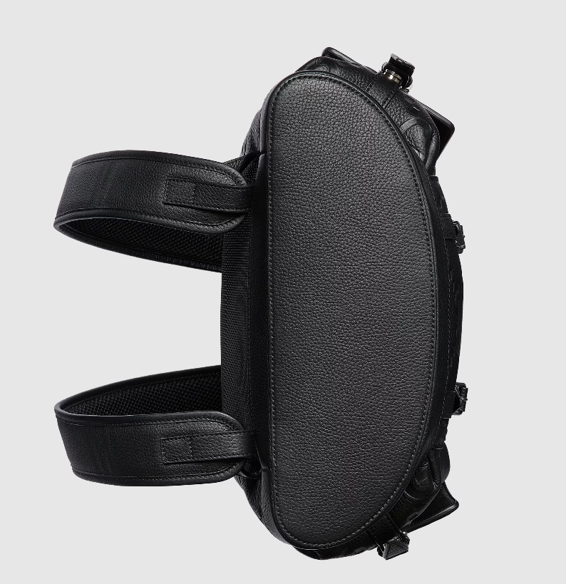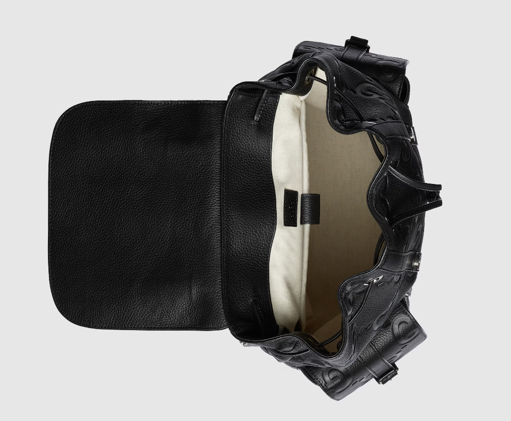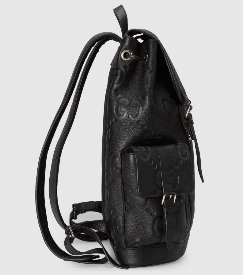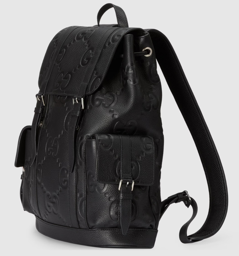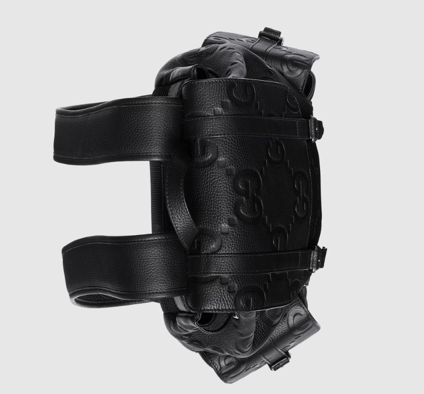 The all-black jumbo GG design returns for Pre-Fall 2023 atop a selection of leather luggage pieces. A reinterpretation of Guccio Gucci's initials, the motif is an evergreen of the House that appears prominently in maxi size for an eye-catching logo feel. This backpack in the emblematic leather features multiple pockets and easy wear shoulder straps.