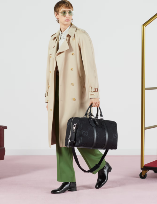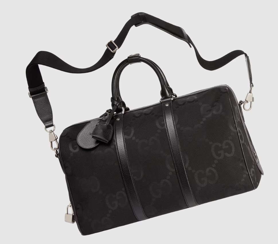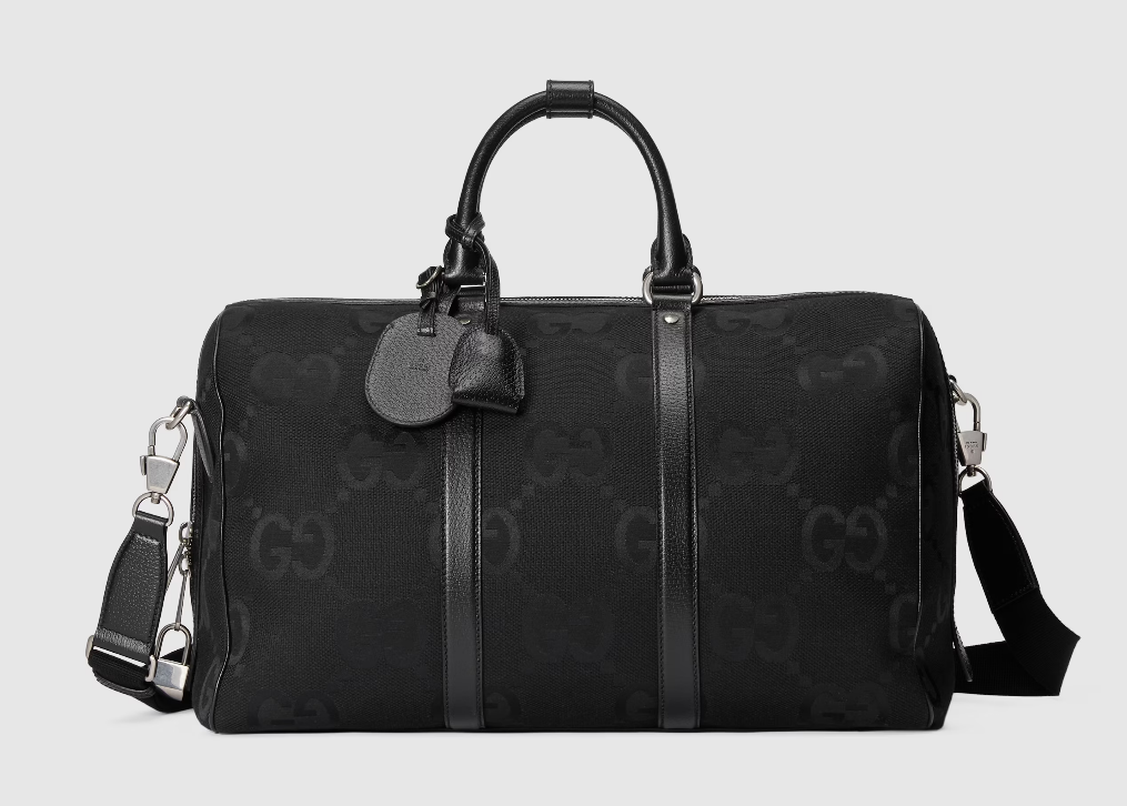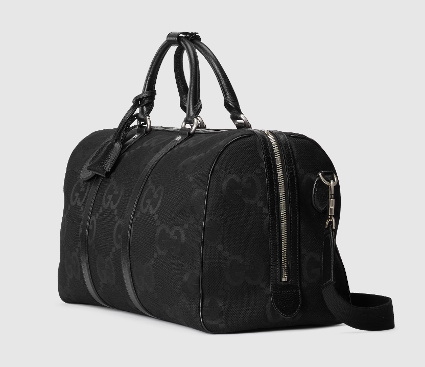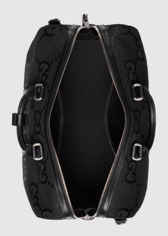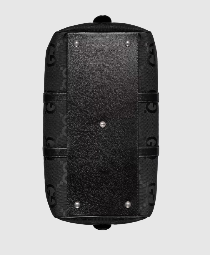 Signature luggage pieces from the jumbo GG line spotlight an all-black design for Spring Summer 2023. A reinterpretation of Guccio Gucci's initials, the GG features prominently in maxi size for a distinctive logo feel. Here it defines this small duffle bag, complete with a tonal leather trim and an identification tag, lock and keyholder.