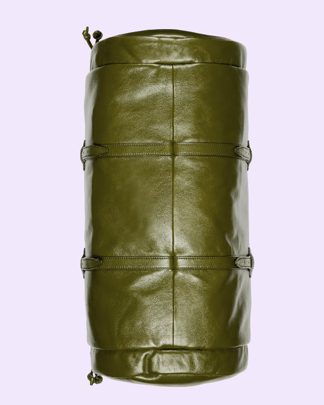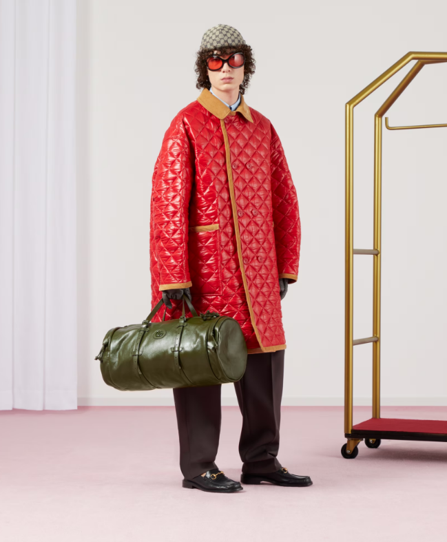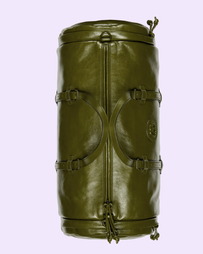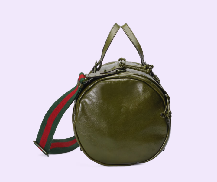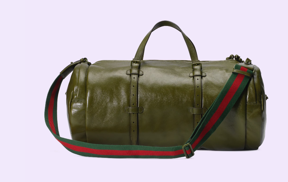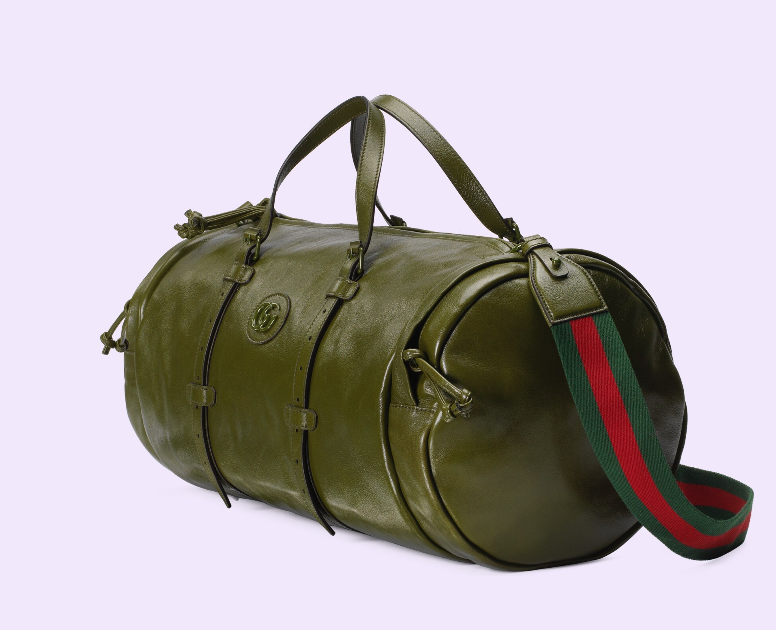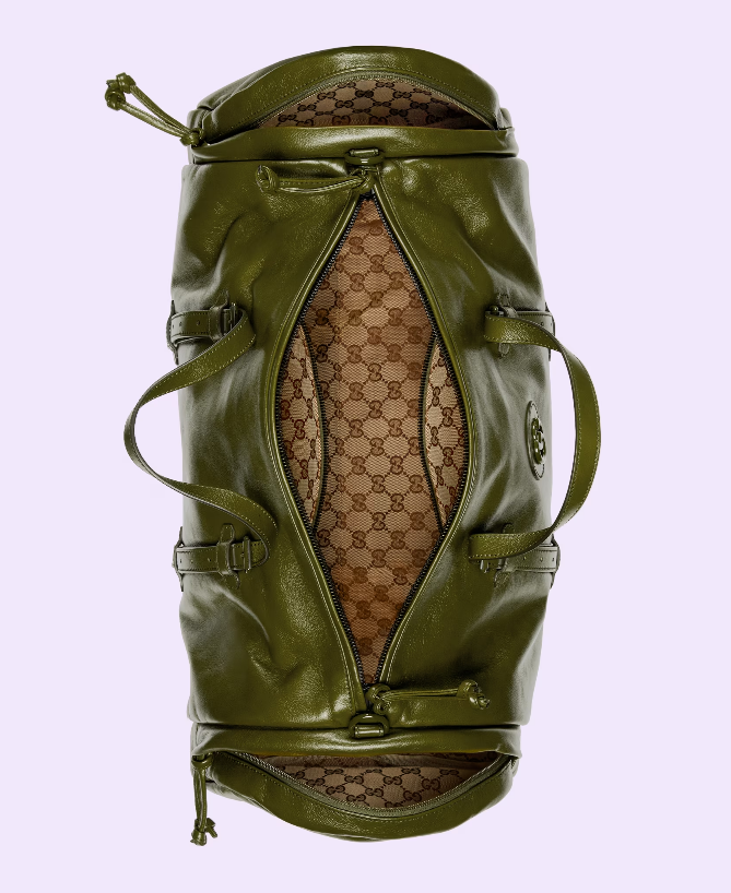 Having appeared in previous collections atop small leather goods, tone-on-tone hardware now enriches the luggage line. The enamel detail offers a softer expression of the emblematic Double G, resulting in an understated travel accessory. Here it defines a large forest green leather duffle bag with an elegant logo feel.