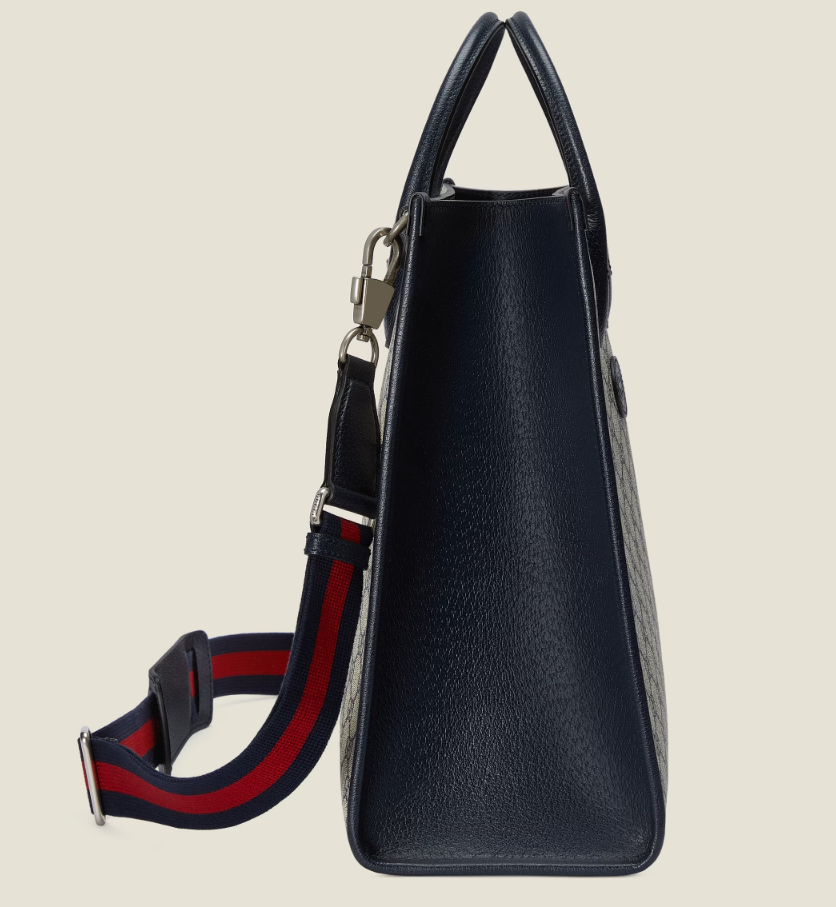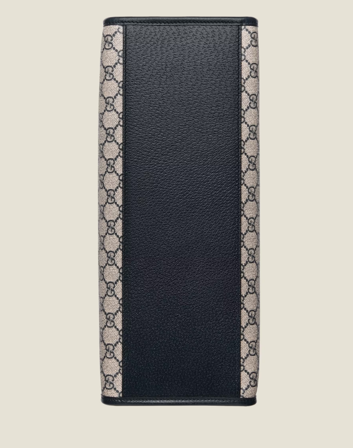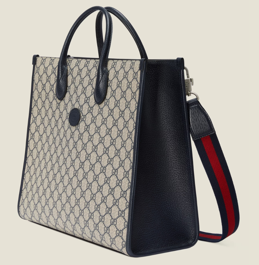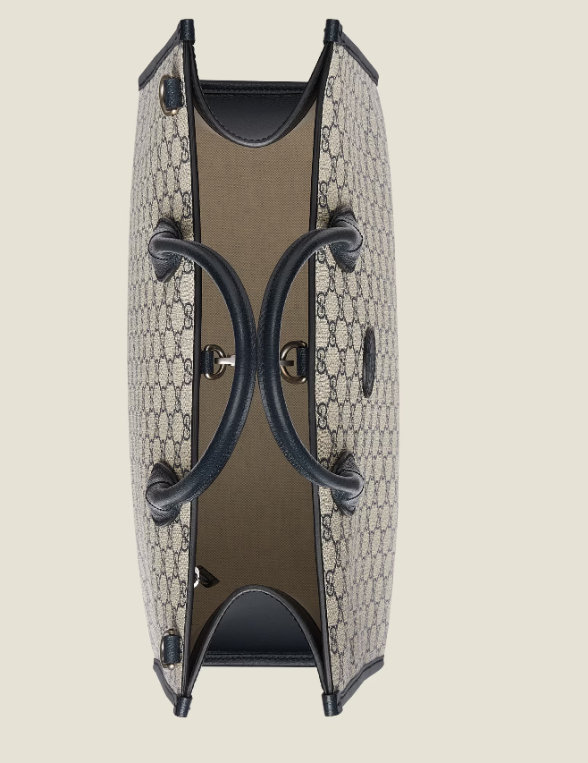 Mirroring the material's historic origins, GG Supreme is introduced in a timeless mix of blue and beige for Gucci Love Parade. The canvas has come to the front of each collection decade after decade to become a hallmark of the House. Here, the classic palette defines this medium Interlocking G tote bag.