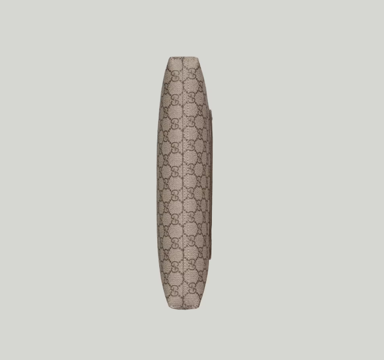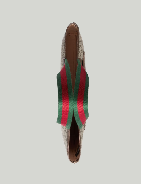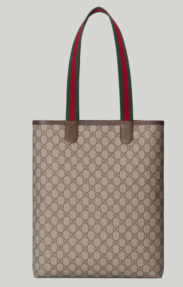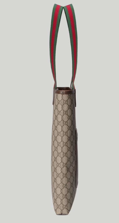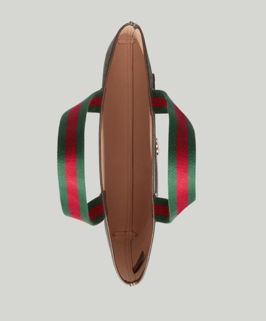 New silhouettes are introduced each season, providing versatile travel accessories to suit any destination. The Ophidia line continues to sport some of Gucci's signature elements. The Double G and Web stripe remain integral to the design, presented in green and red alongside the GG Supreme canvas in beige and ebony as part of this small tote bag.