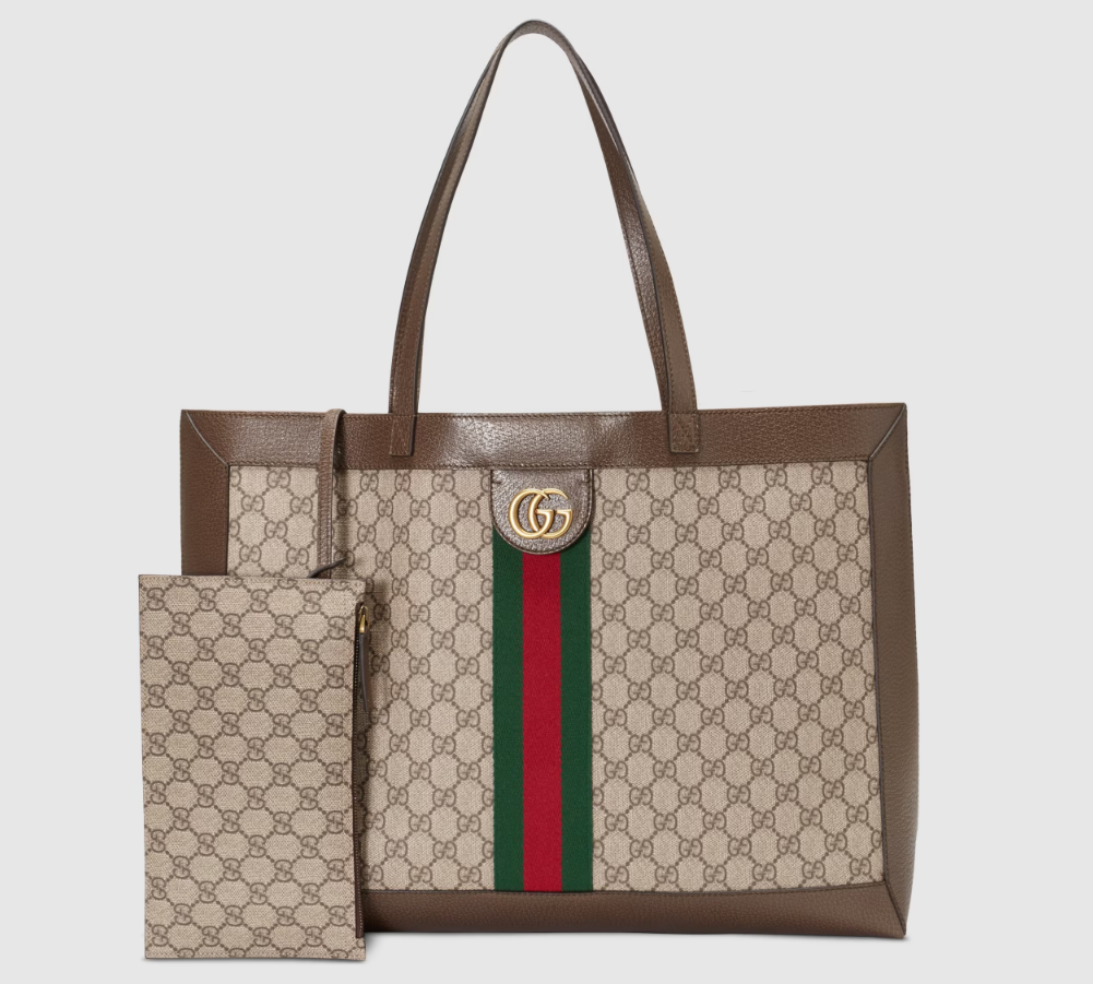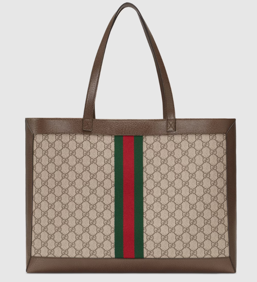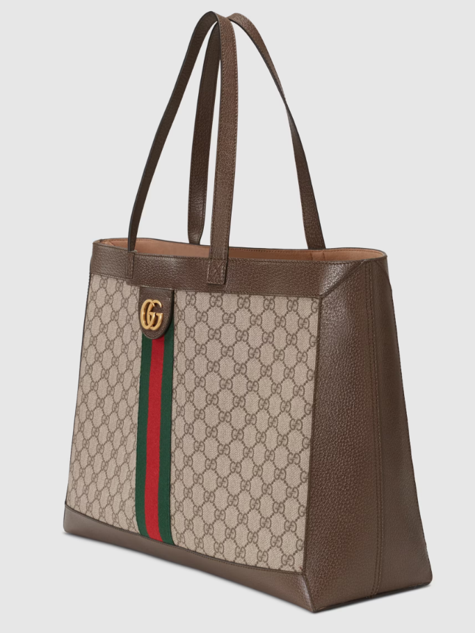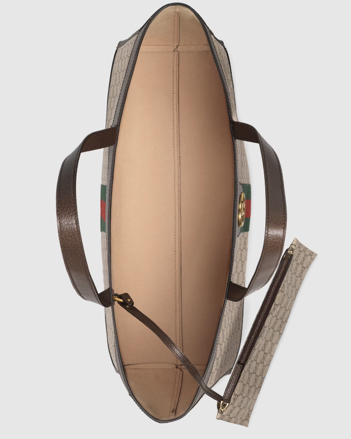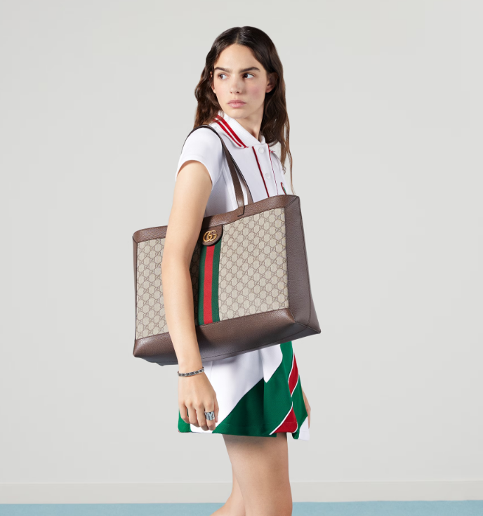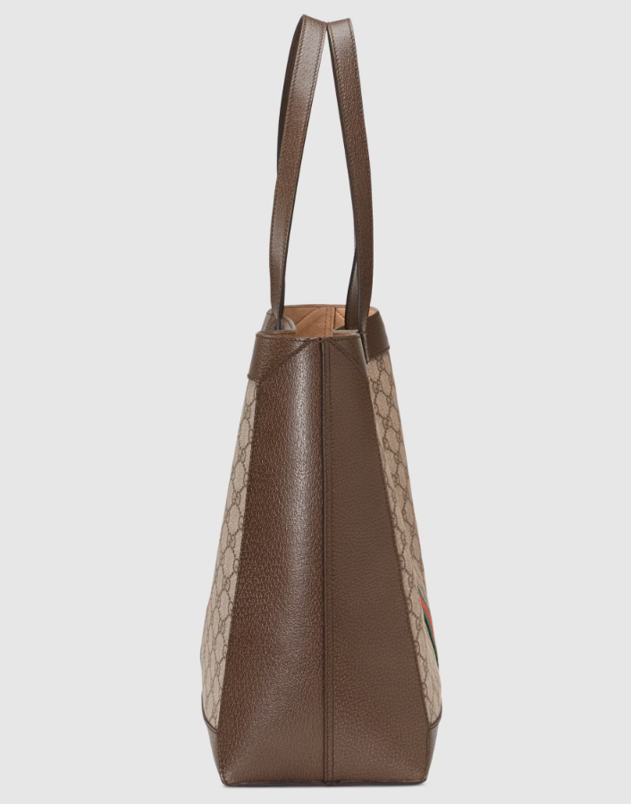 A classic combination of the House's most recognisable elements—the GG motif and Web stripe—the world of Ophidia continues to evolve, incorporating new shapes and silhouettes. The wide tote is made from supple soft GG Supreme canvas, trimmed with textured leather and topped with Double G hardware. Thanks to its long leather handles, the style can also be carried as a shoulder bag.