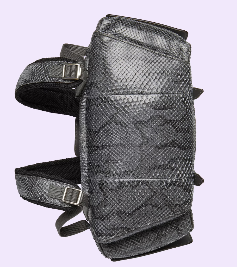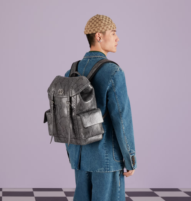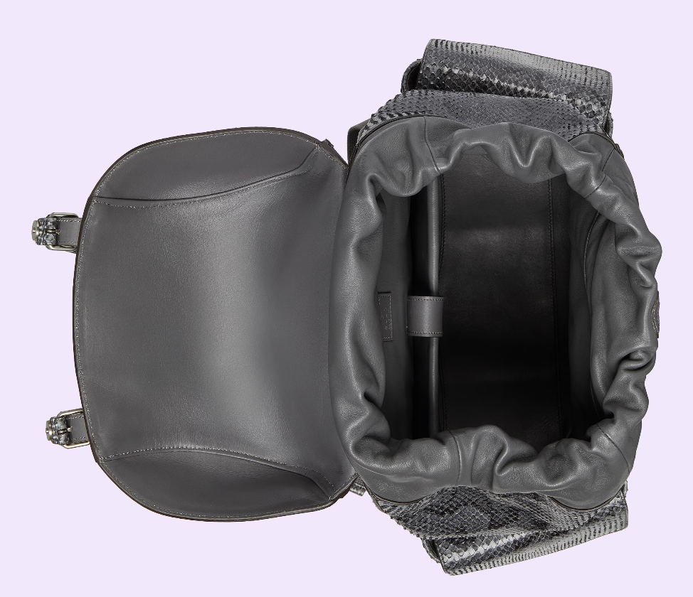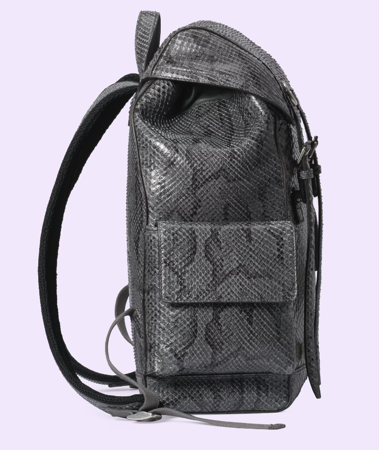A sign of the House's ever-evolving design narrative, signature luggage pieces appear as a part of the latest collection in python leather. The striking dark grey tone in precious material mixes with the Double G logo, bringing this backpack's emblematic hardware to the fore.