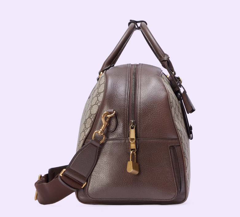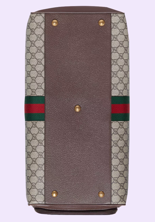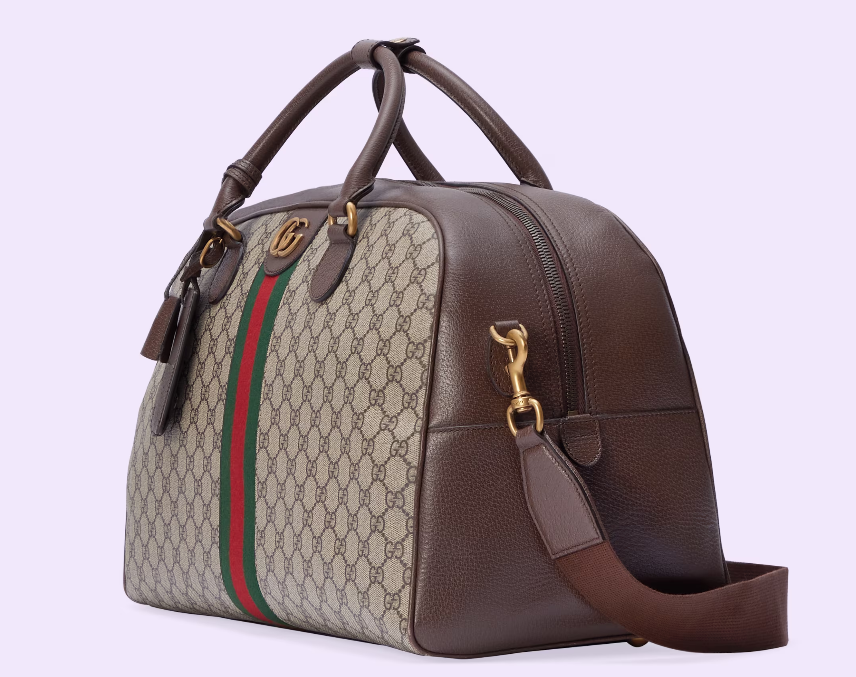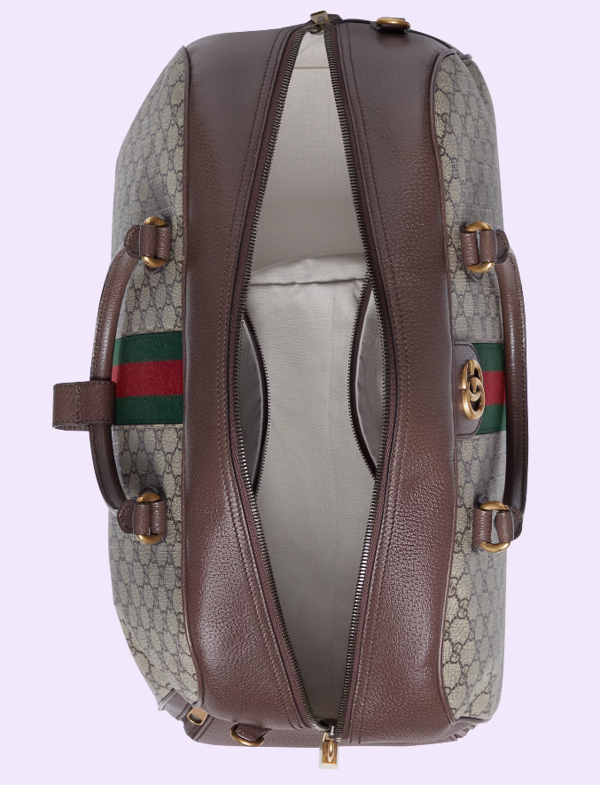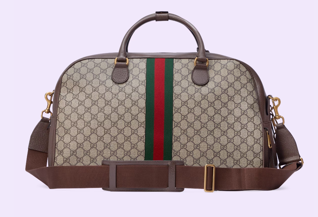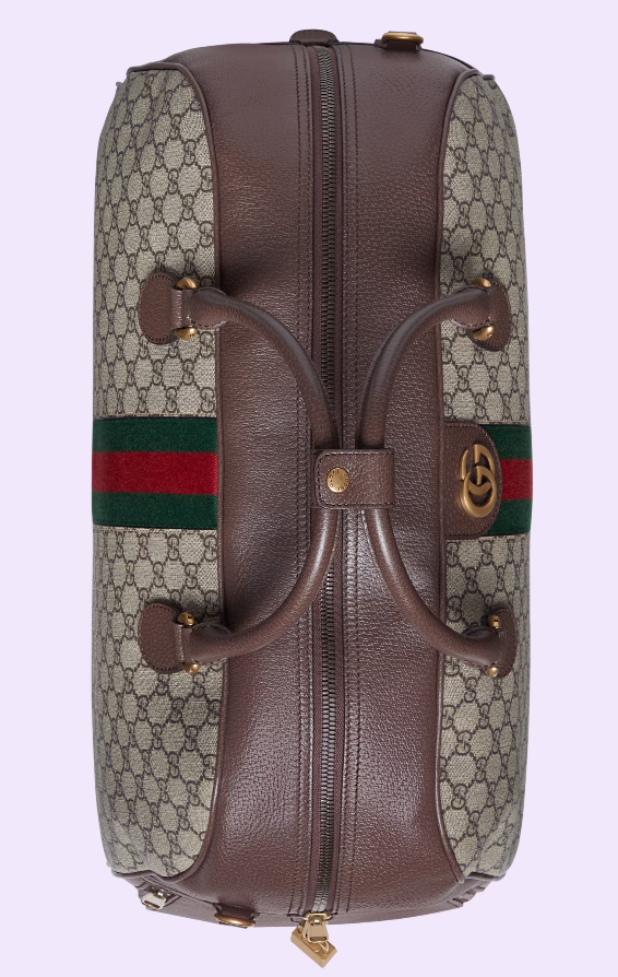 An unmistakable combination of the House's most recognizable elements—the GG motif and Web stripe. The Gucci Savoy line evolves as part of Cruise 2023 Gucci Cosmogonie, reinventing classic shapes in new colorways, resulting in a modern and refined offering. This large duffle bag features a double top handle and detachable shoulder strap.