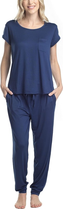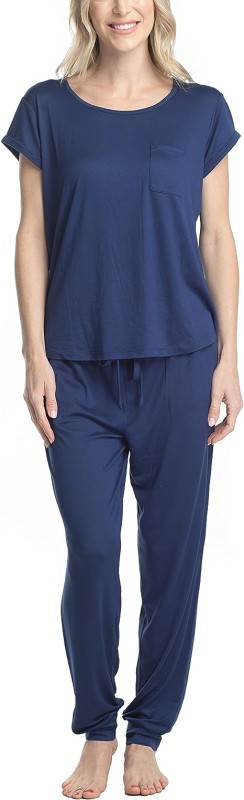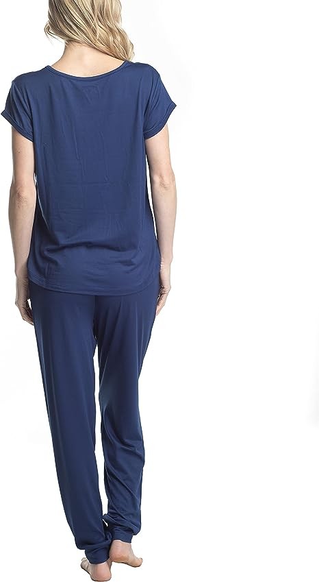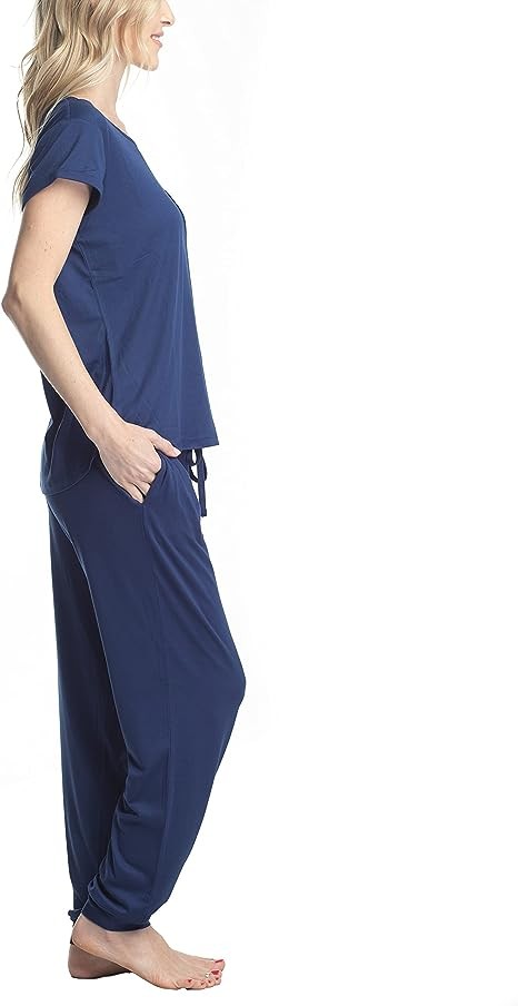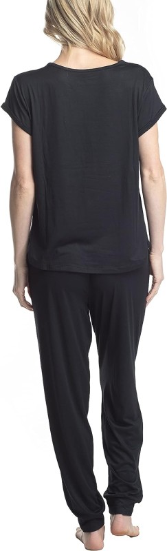 This pajama set includes a hooded short sleeve top and a sporty jogger sleep pant available in Small, Medium, Large