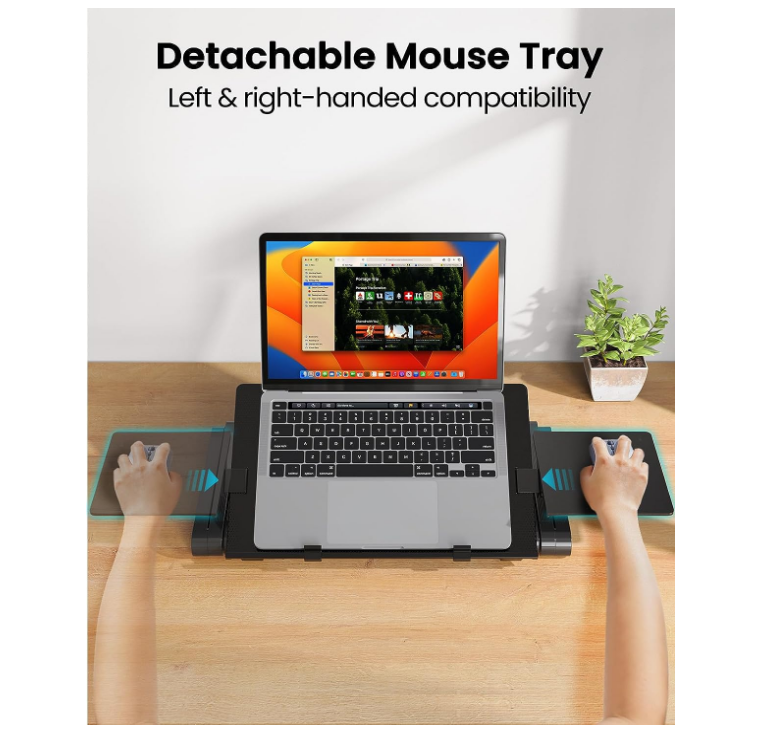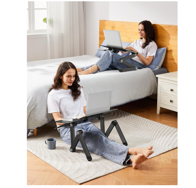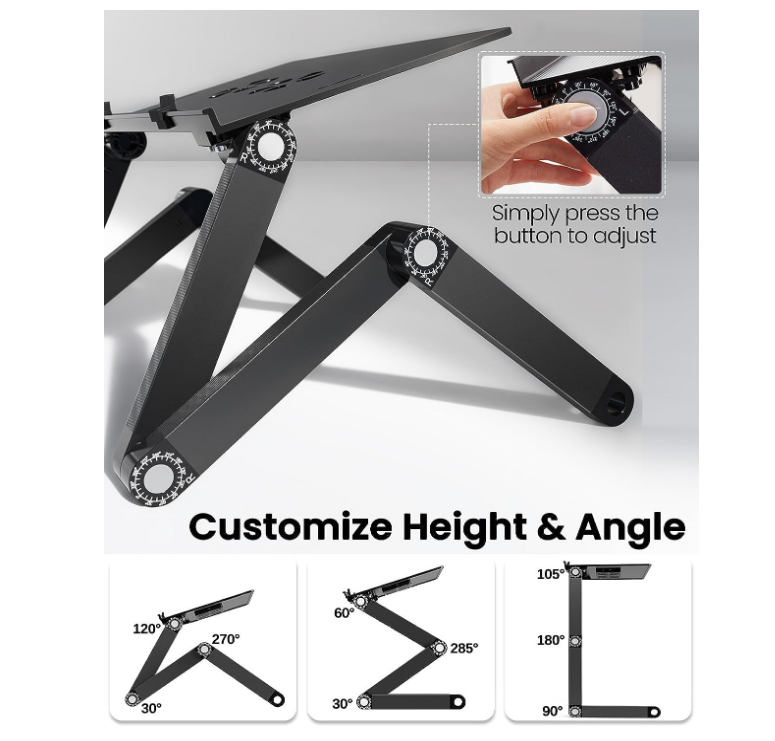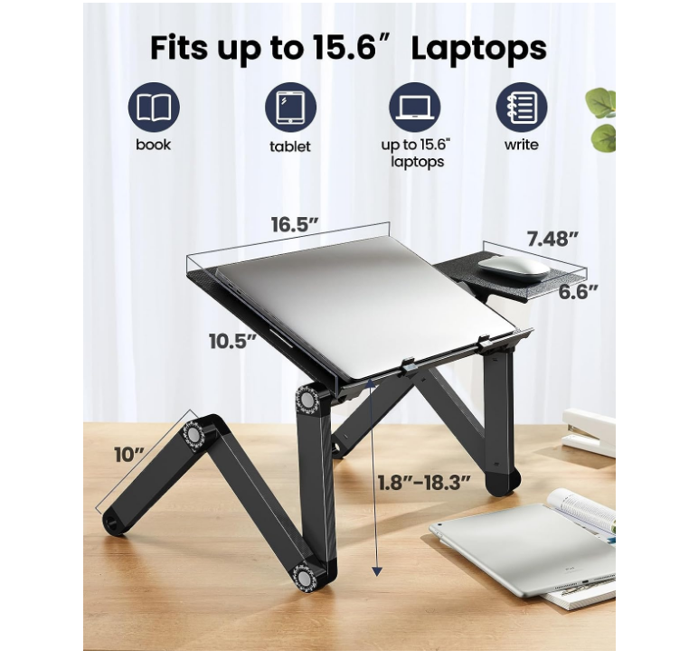 【Compatible with up to 15.6" Laptop Stand for Desk】Our desk laptop stand is made of lightweight, high-strength aluminum tray and ABS plastic auto-locking joints. It fits well and performs better for up to 15.6" inch all MacBooks, Notebooks, tablets, and laptops; An extra anti-slip clip on the laptop table tray is designated to clamp the stuff in place.